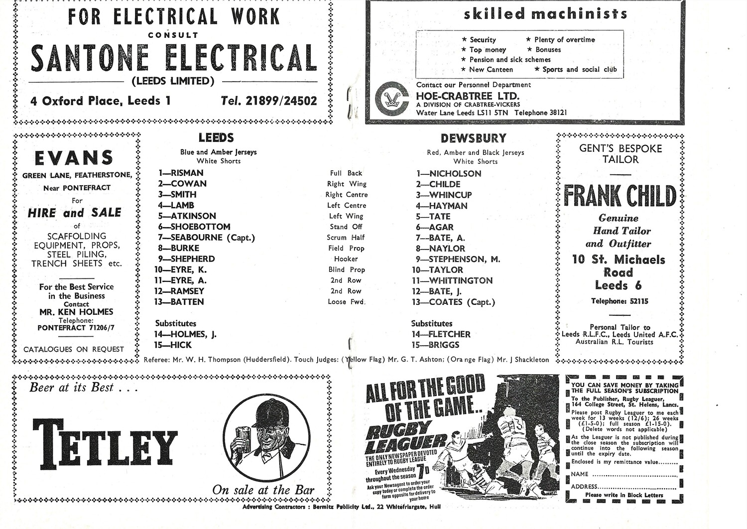 1969/70 Leeds v Dewsbury (06/12/1969) Rugby League Programme