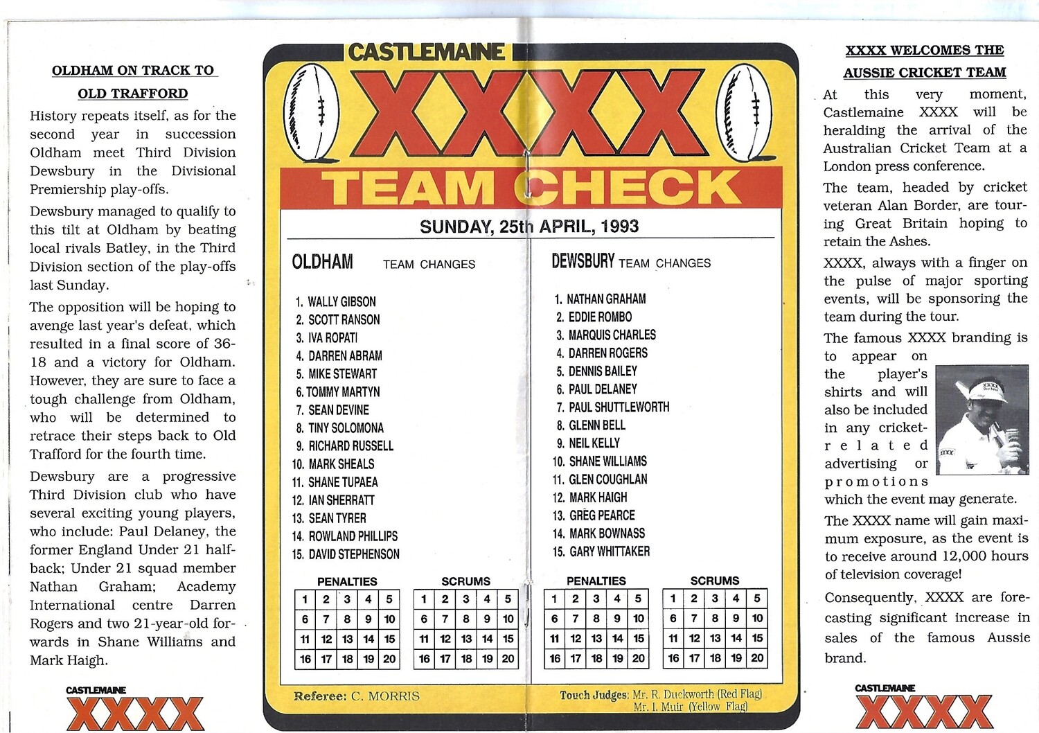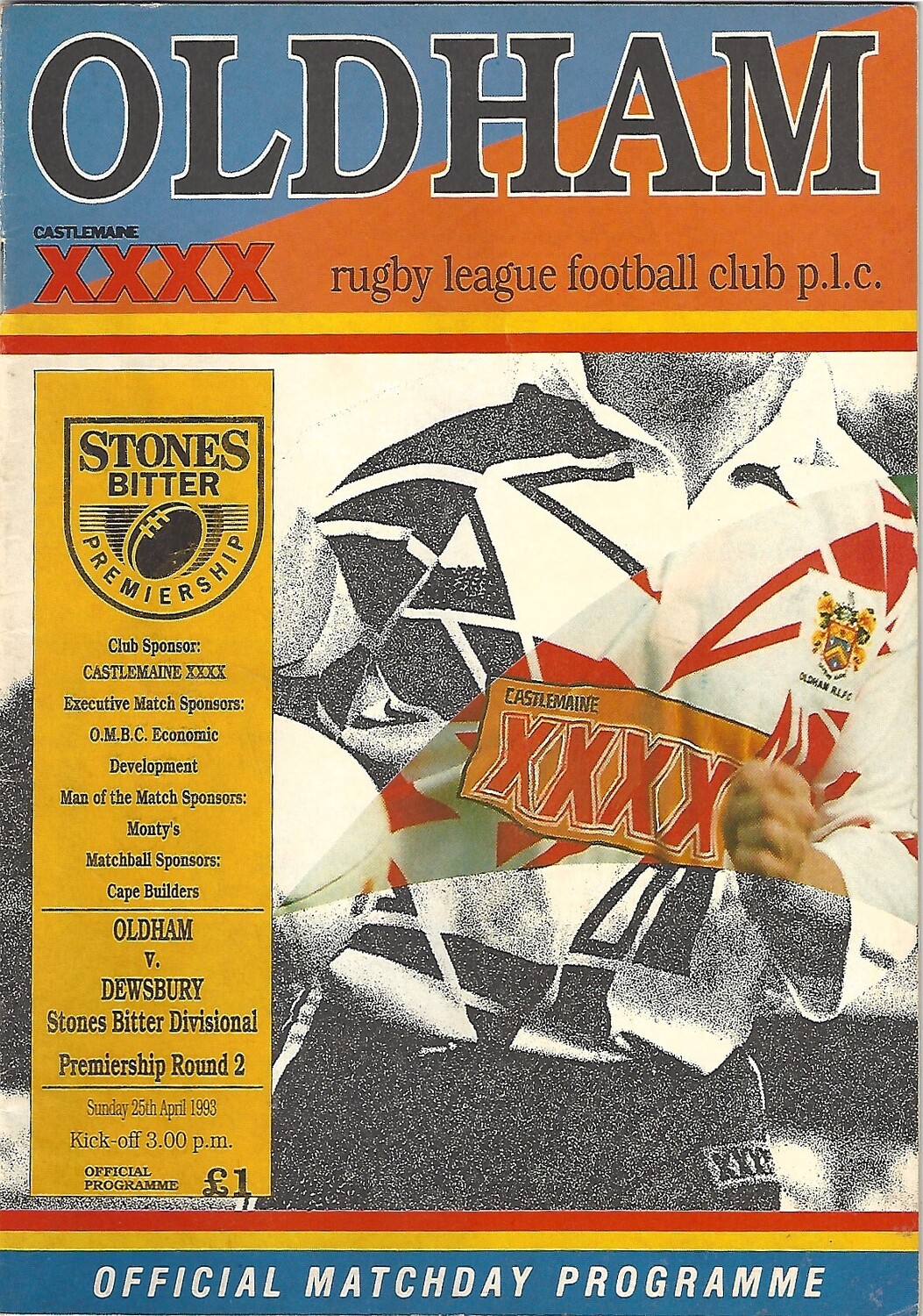 1992/93 Oldham v Dewsbury Stones Bitter Divisional Premership Round 2 Rugby League Programme