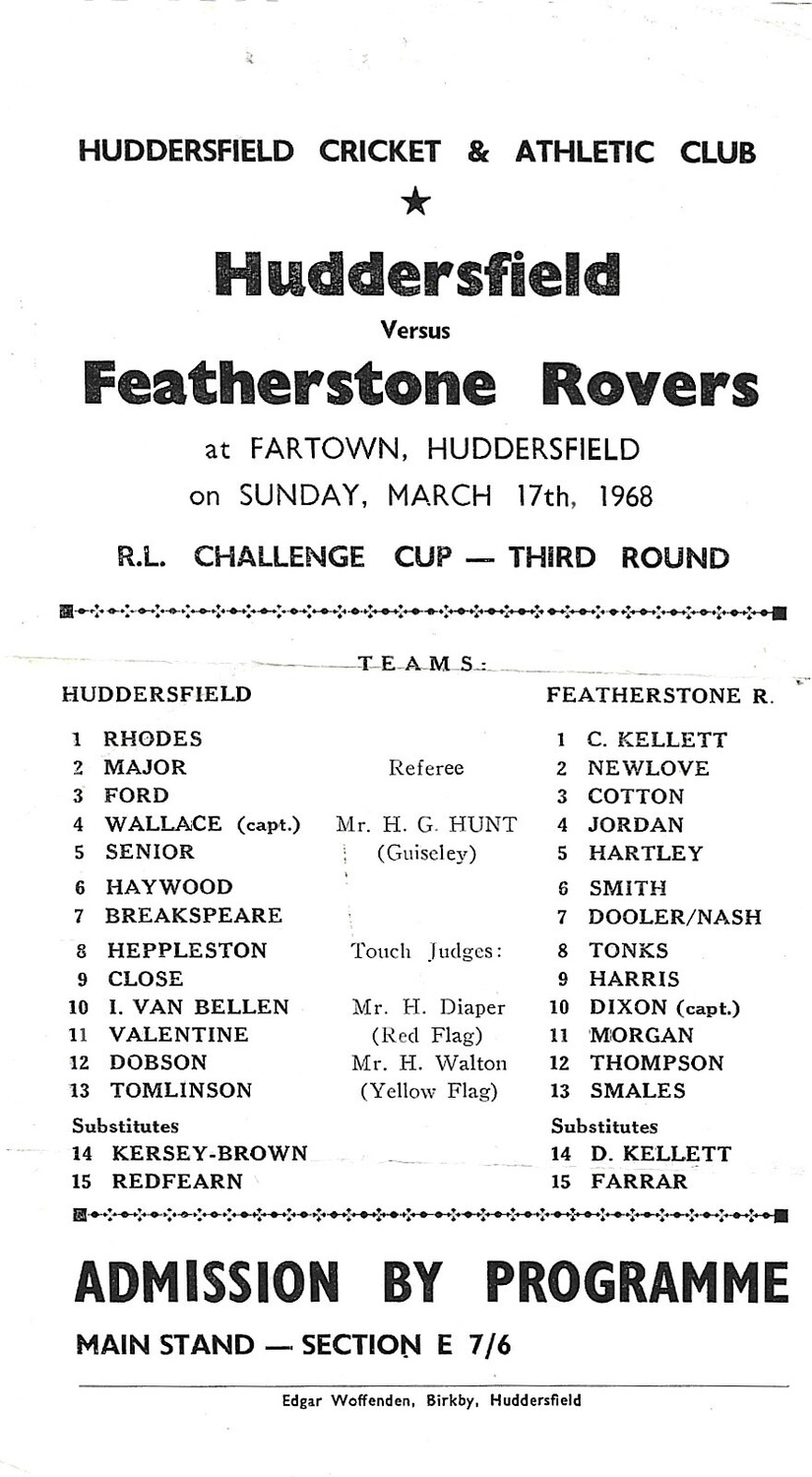 1967/68 Huddersfield v Featherstone Rovers Rugby League Challenge Cup 3rd Round Programme