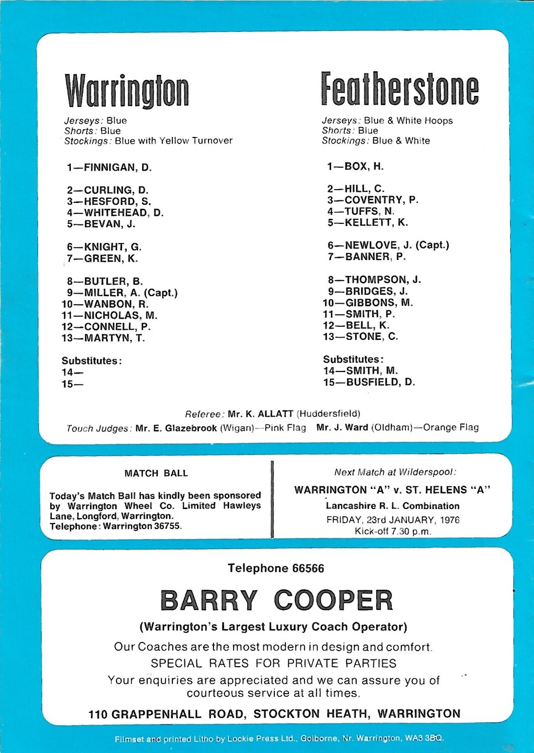 1975/76 Warrington v Featherstone Rovers Rugby League Programme