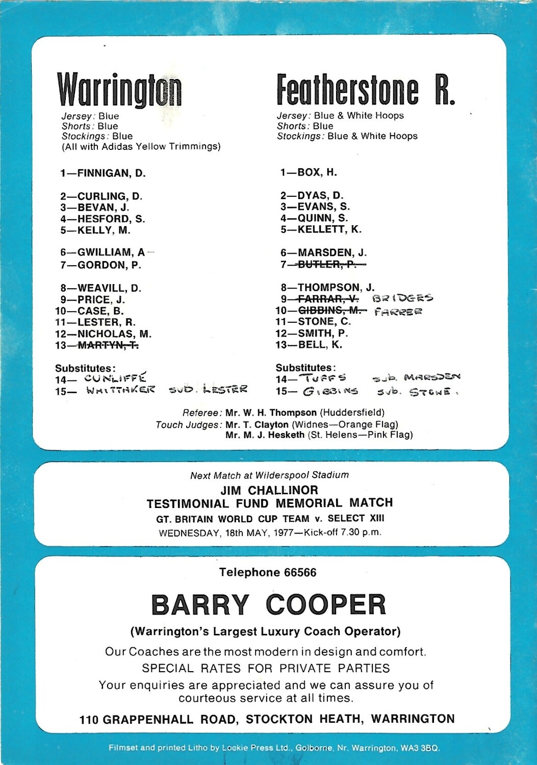 1976/77 Warrington v Featherstone Rovers Premiership Play Off Semi Final 2nd Leg Rugby League Programme