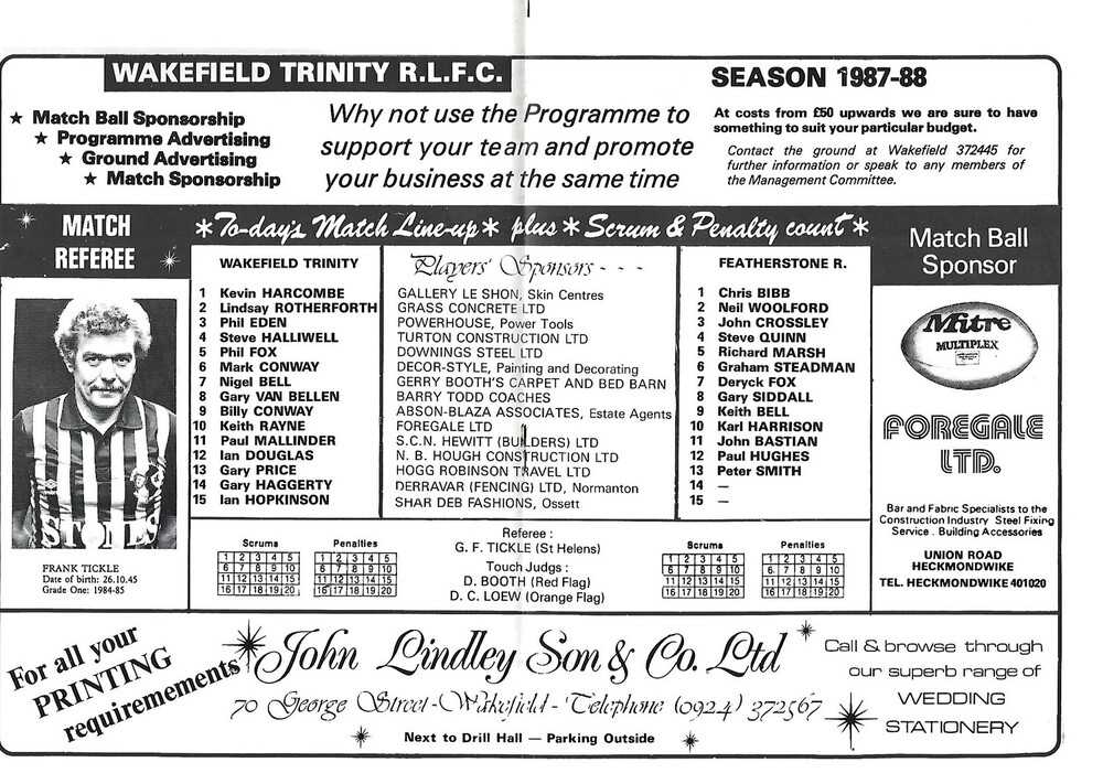 1987/88 Wakefield Trinity v Featherstone Rovers Rugby League Programme