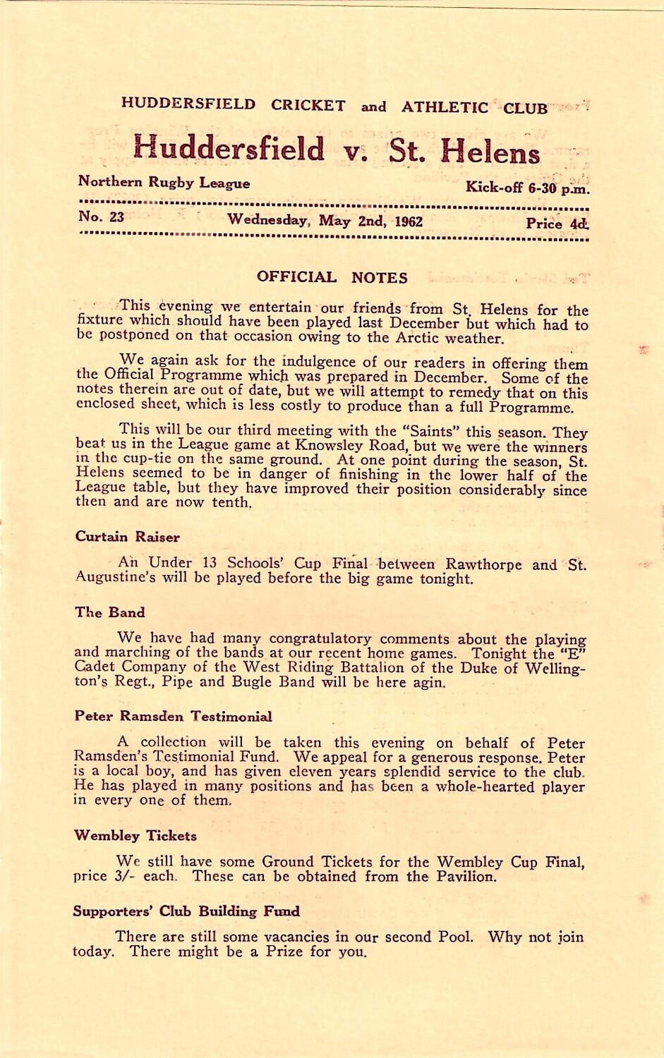 Original game (23/12/1961) not played due to adverse weather. Game eventually played on 02/05/1962.