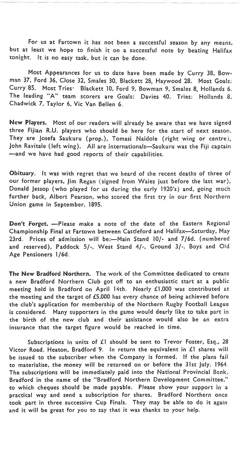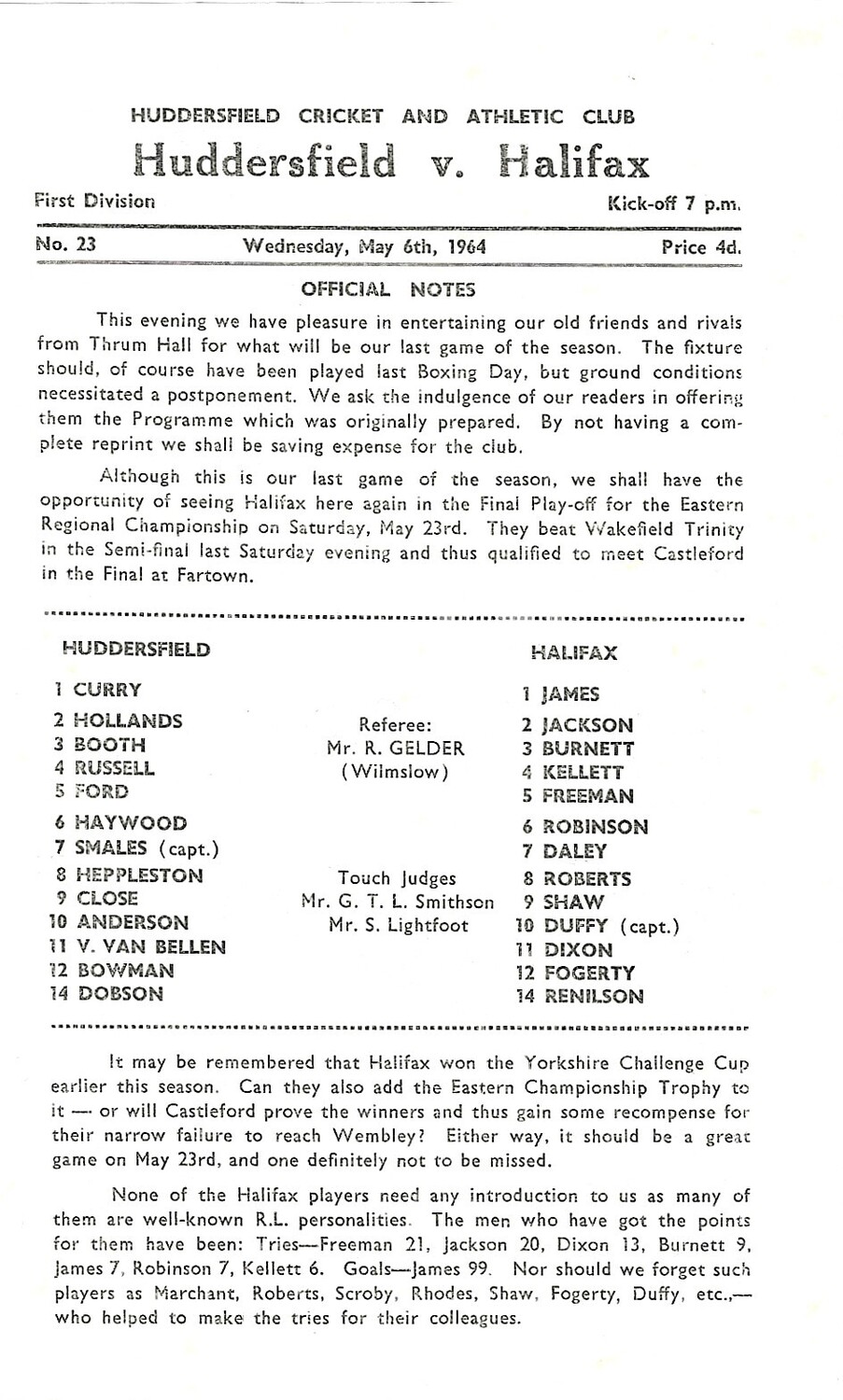 1963/64 Huddersfield v Halifax Rugby League Programme