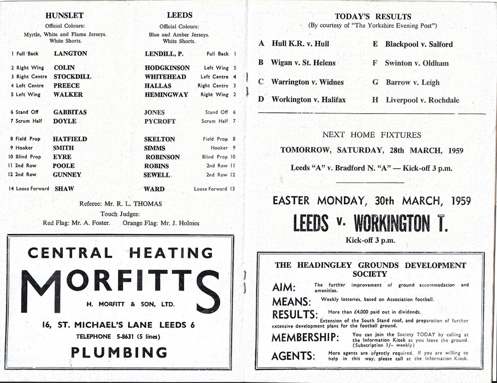 1958/59 Leeds v Hunslet Rugby League programme