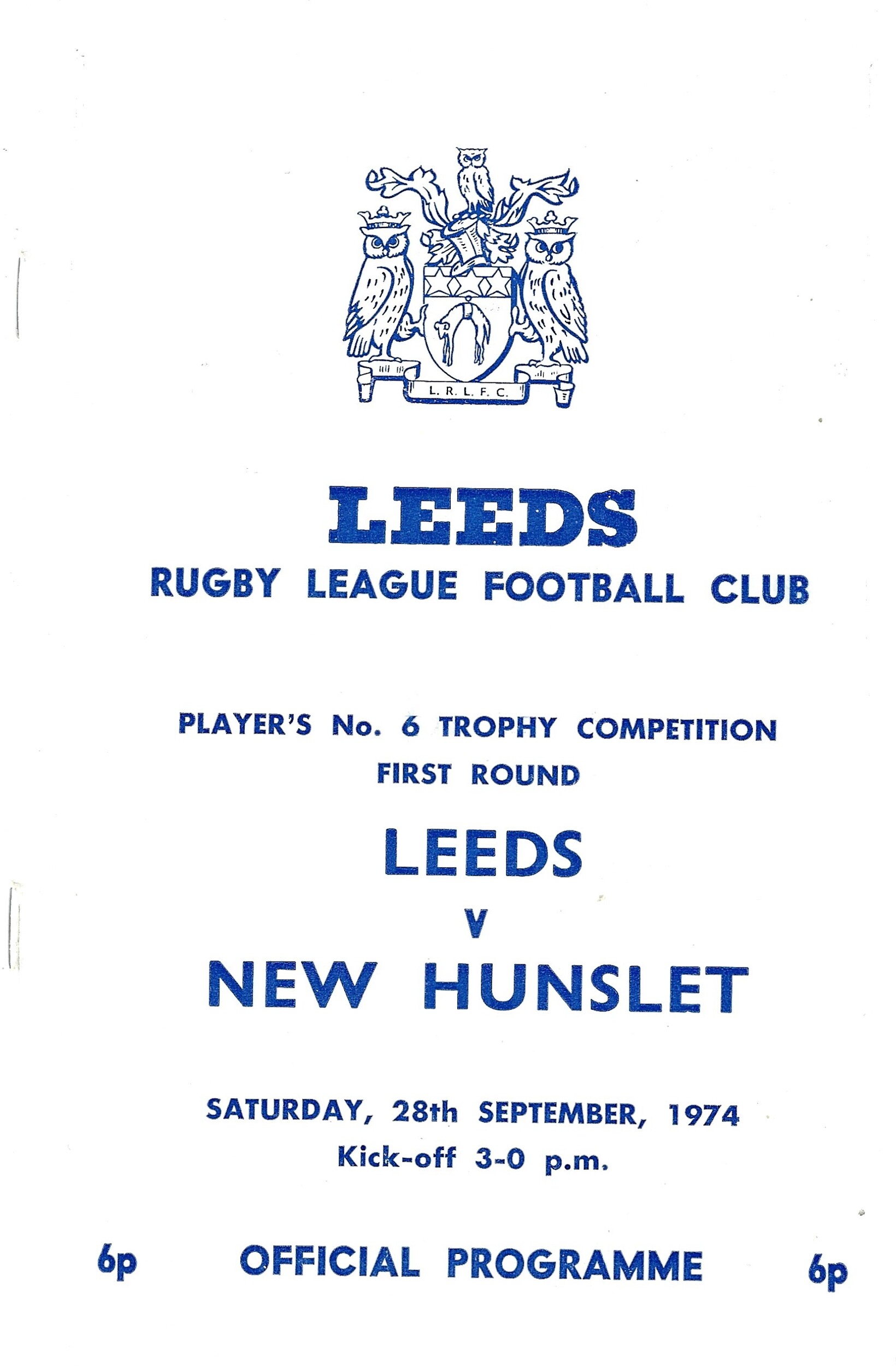1974/75 Leeds v New Hunslet (28/09/1974) Player's No 6 Trophy Competition First Round Rugby League Programme