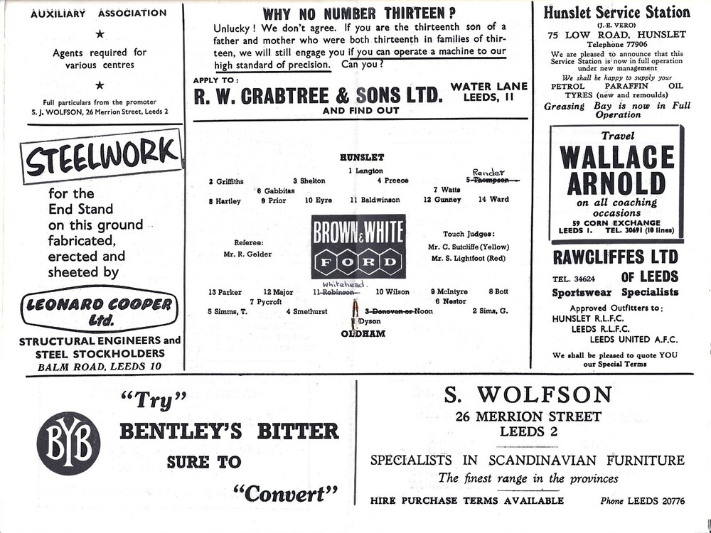1963/64 Hunslet v Oldham Rugby League Challenge Cup Quarter Final Programme