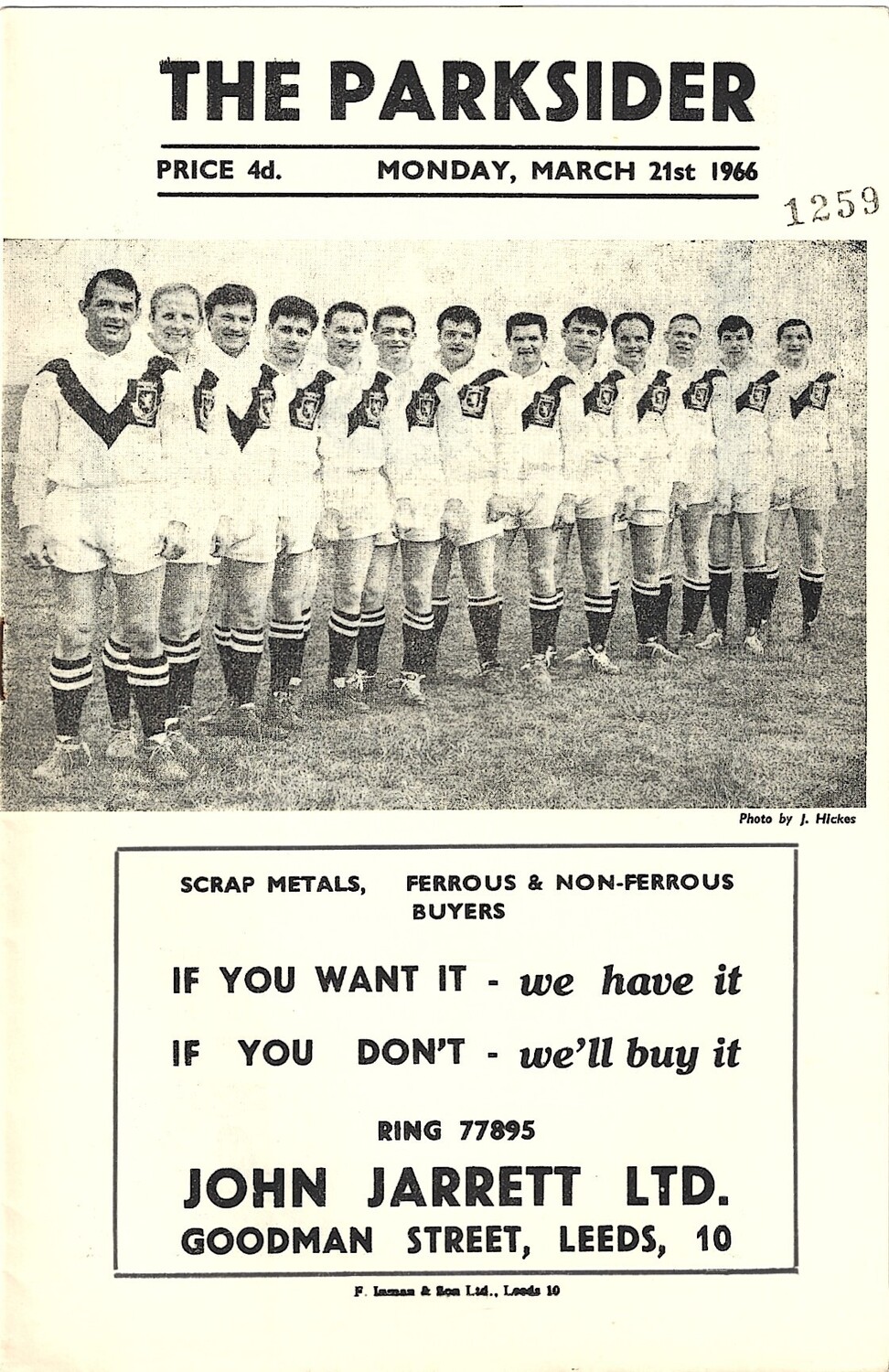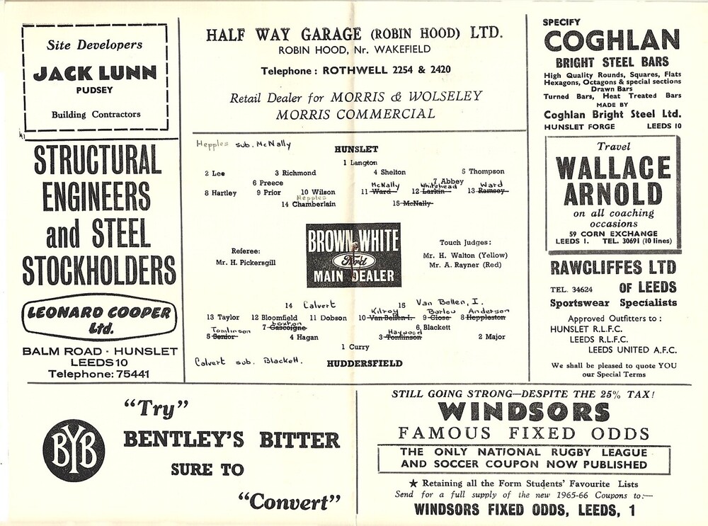 1965/66 Hunslet v Huddersfield Rugby League Programme