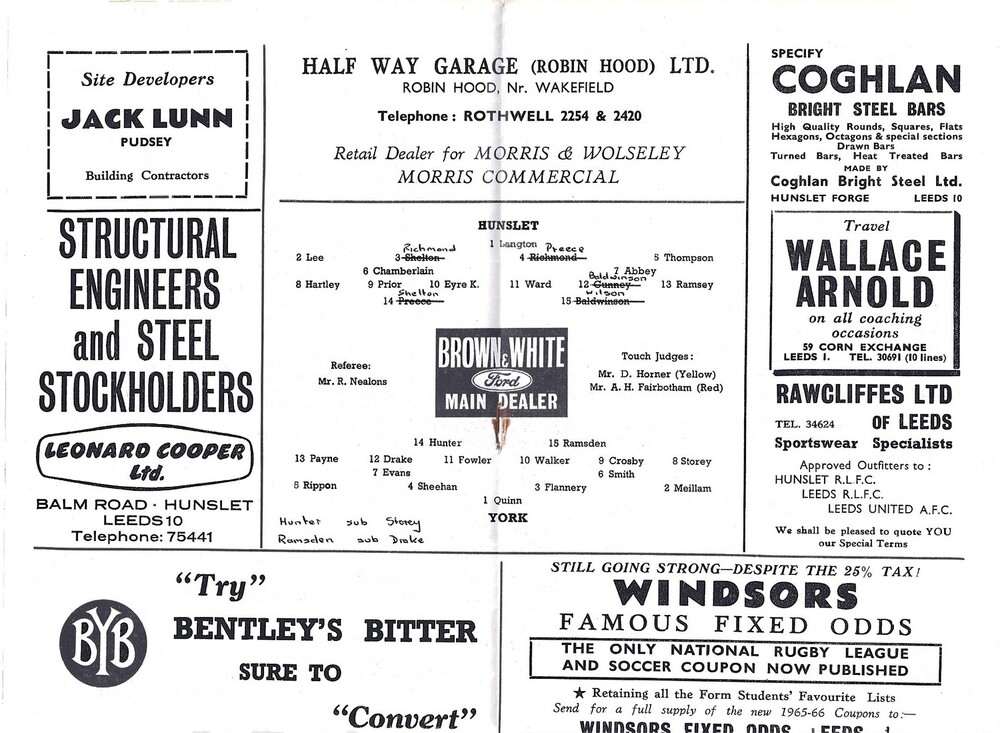 1965/66 Hunslet v York Rugby League Programme