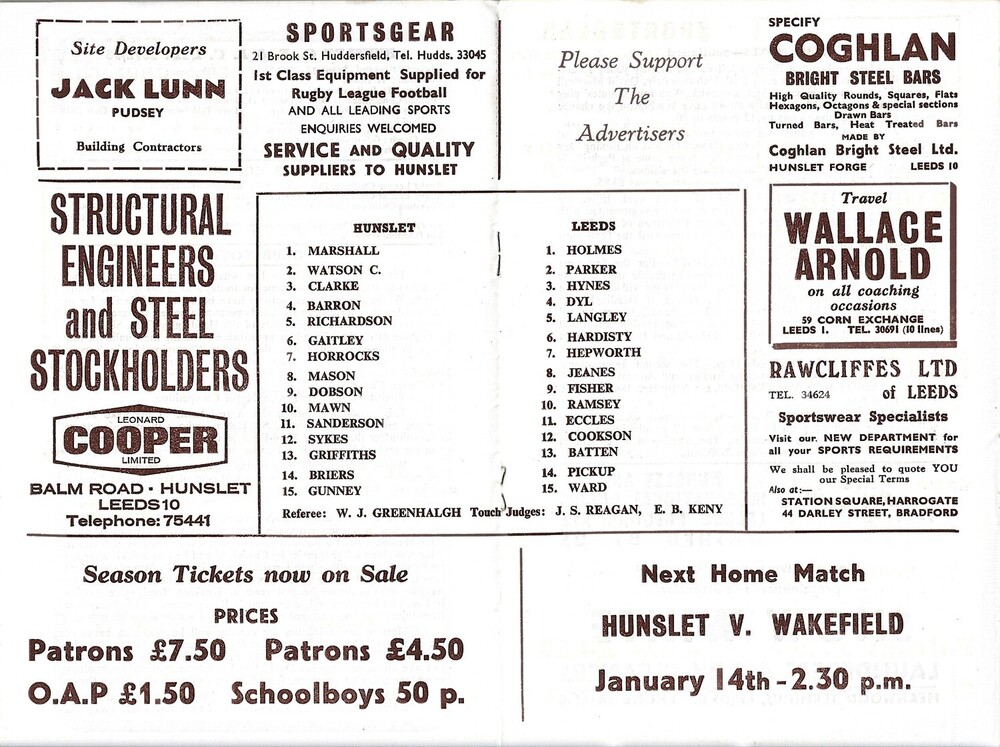 1972/73 Hunslet v Leeds Rugby League programme