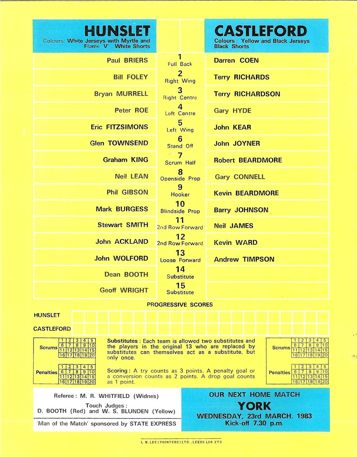 1982/83 Hunslet v Castleford Rugby League Challenge Cup 3rd Round programme