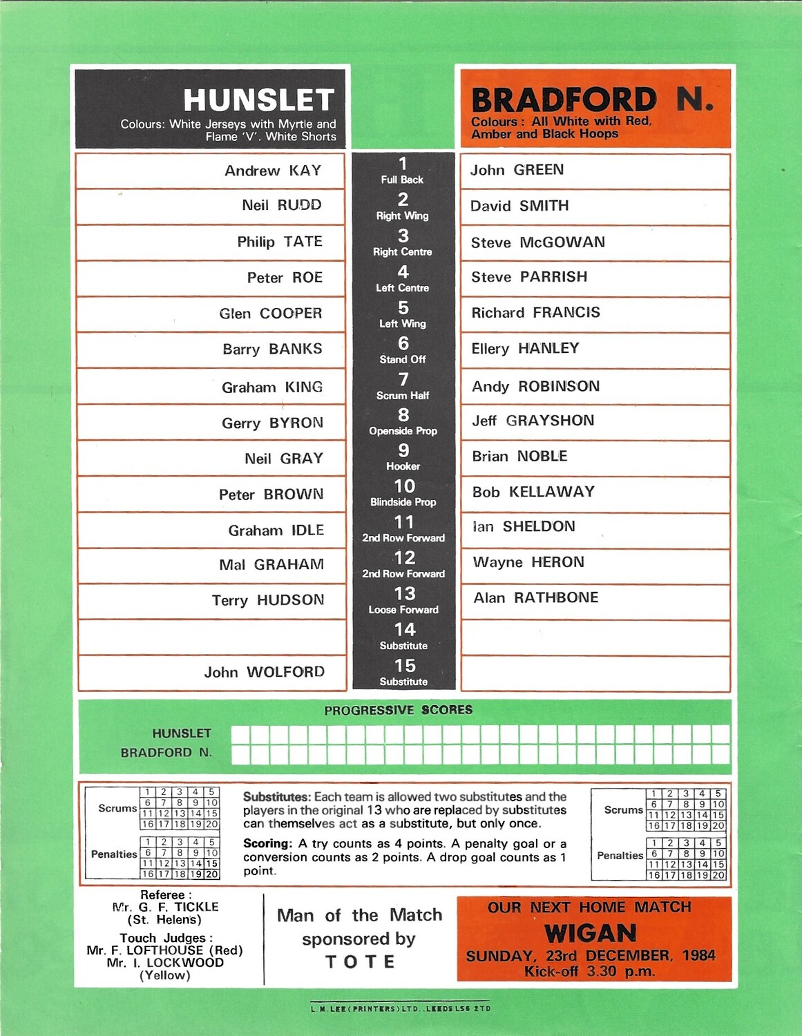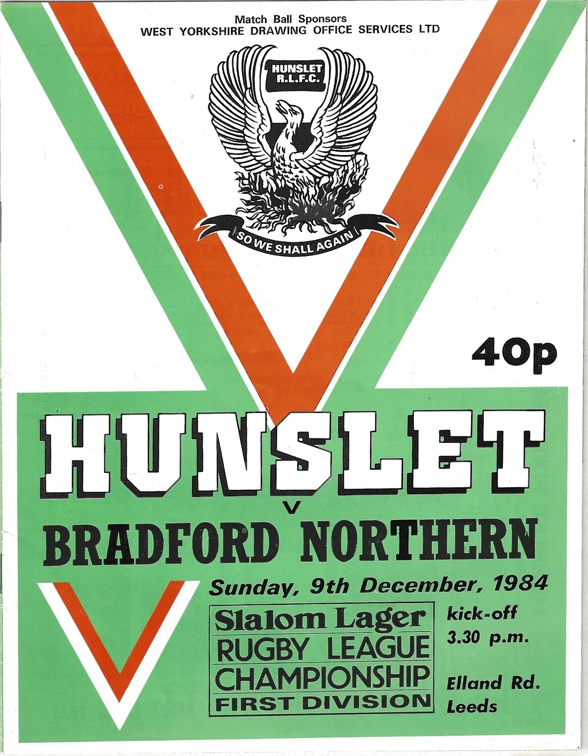 1984/85 Hunslet v Bradford Northern Rugby League programme