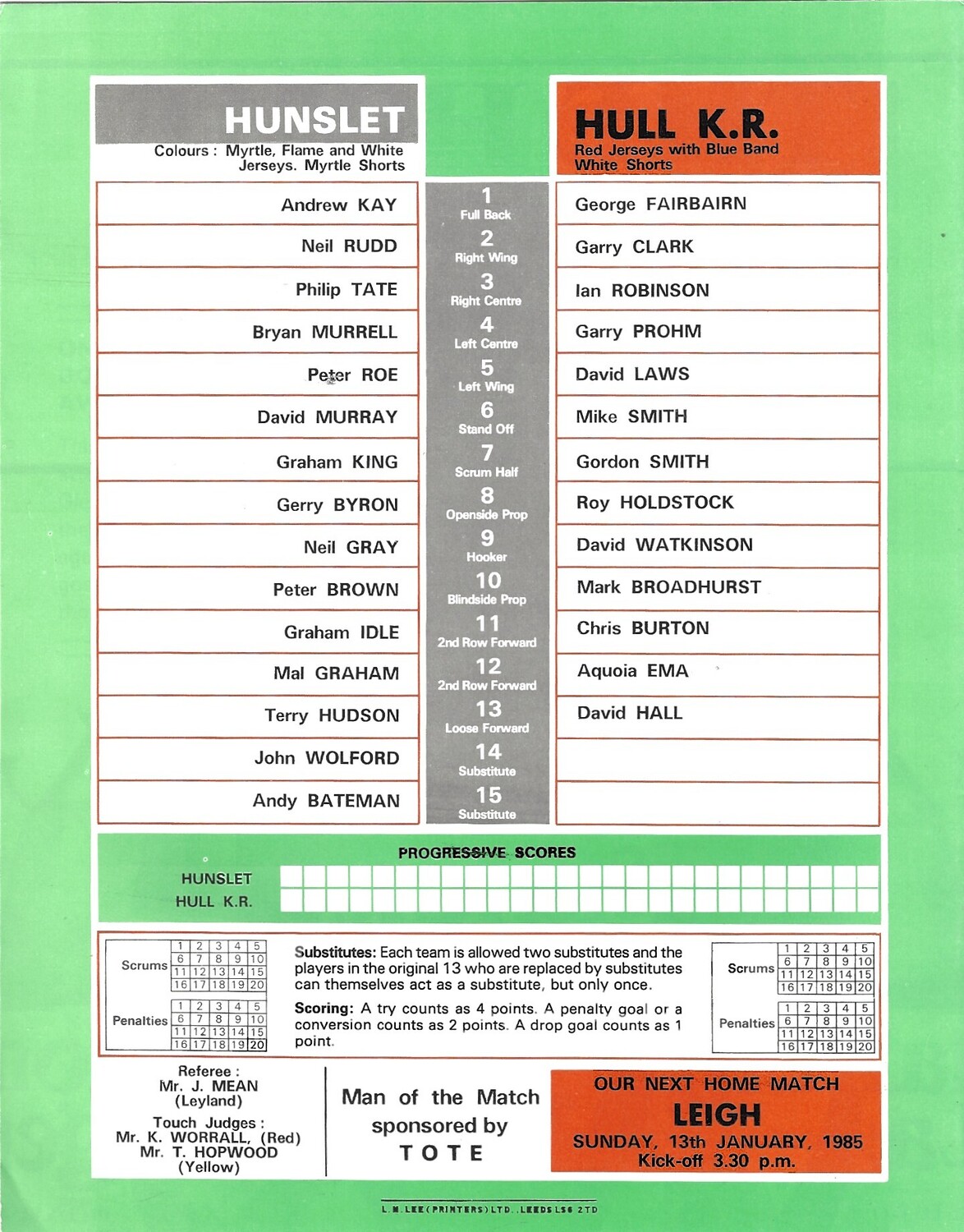 1984/85 Hunslet v Hull Kingston Rovers Rugby League programme