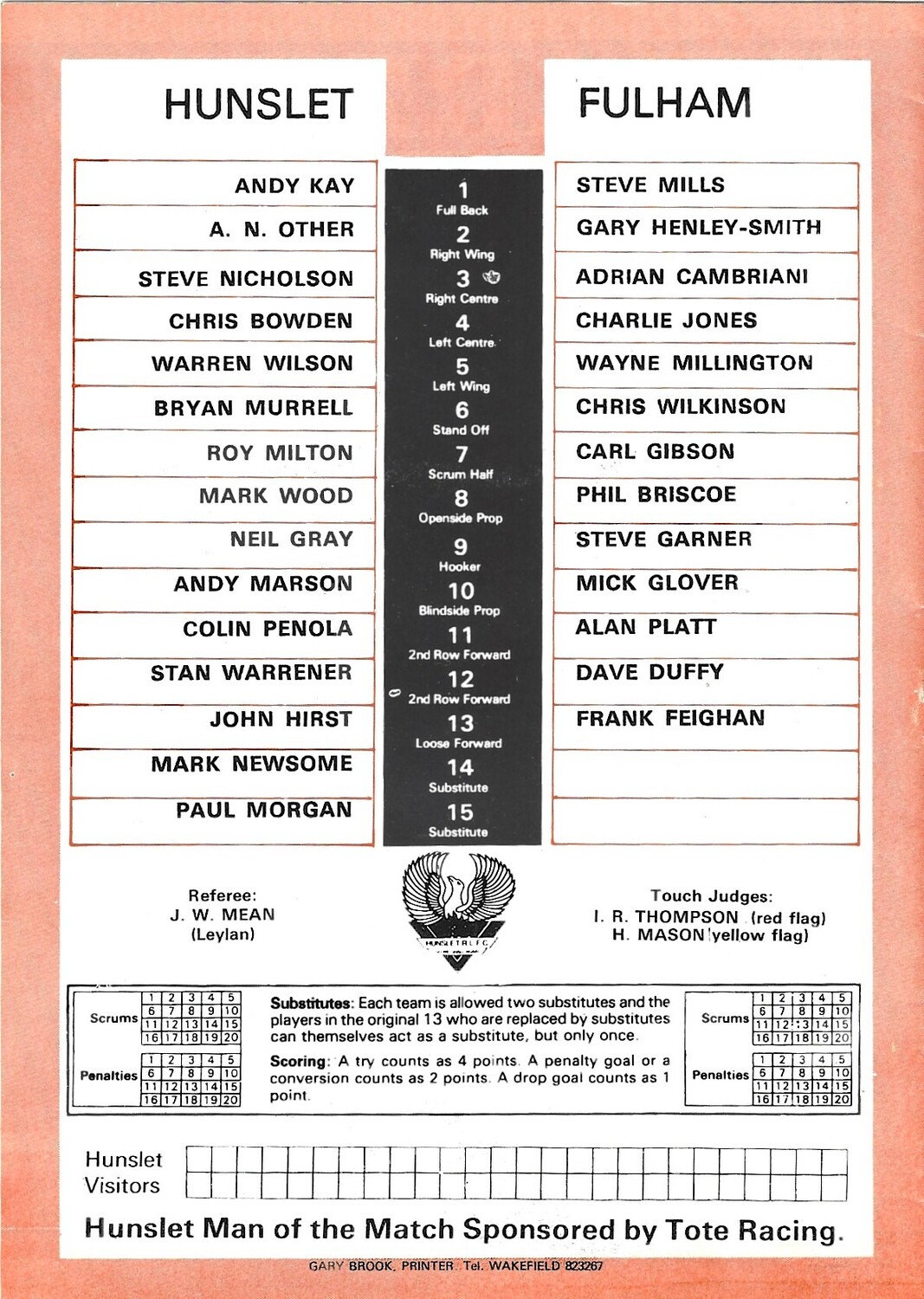 1985/86 Hunslet v Fulham Rugby League programme