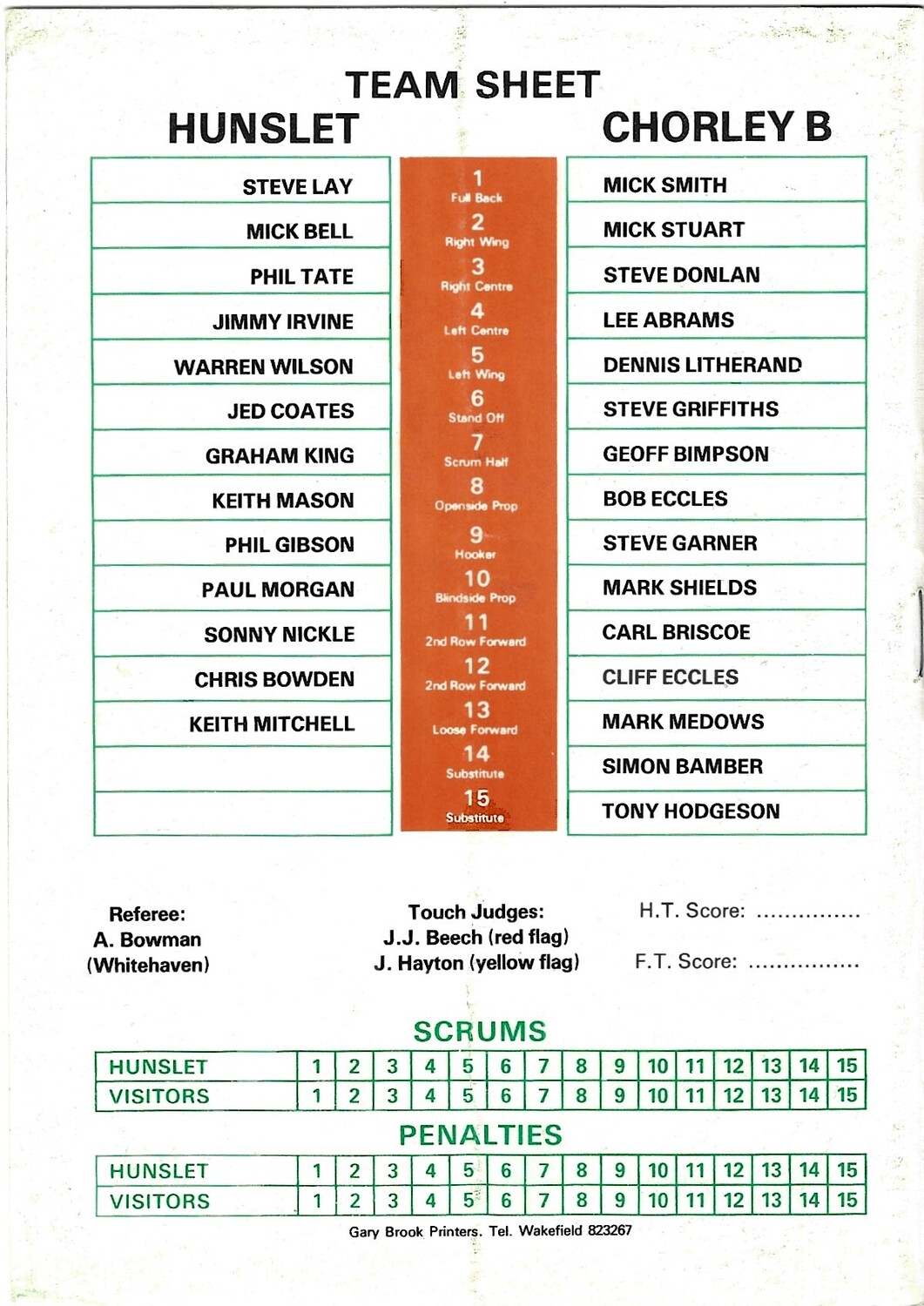 1988/89 Hunslet v Chorley Borough Rugby League programme