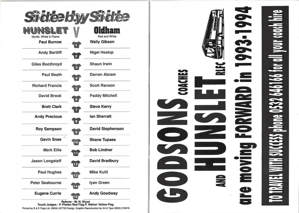 1993/94 Hunslet v Oldham Rugby League Challenge Cup 4th Round programme