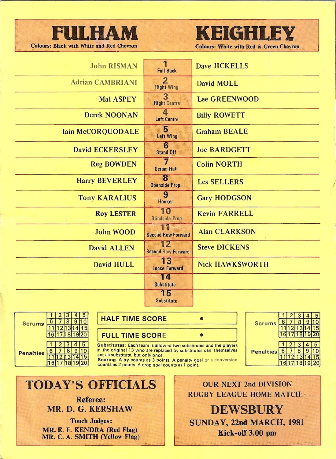 1980/81 Fulham v Keighley Rugby League programme