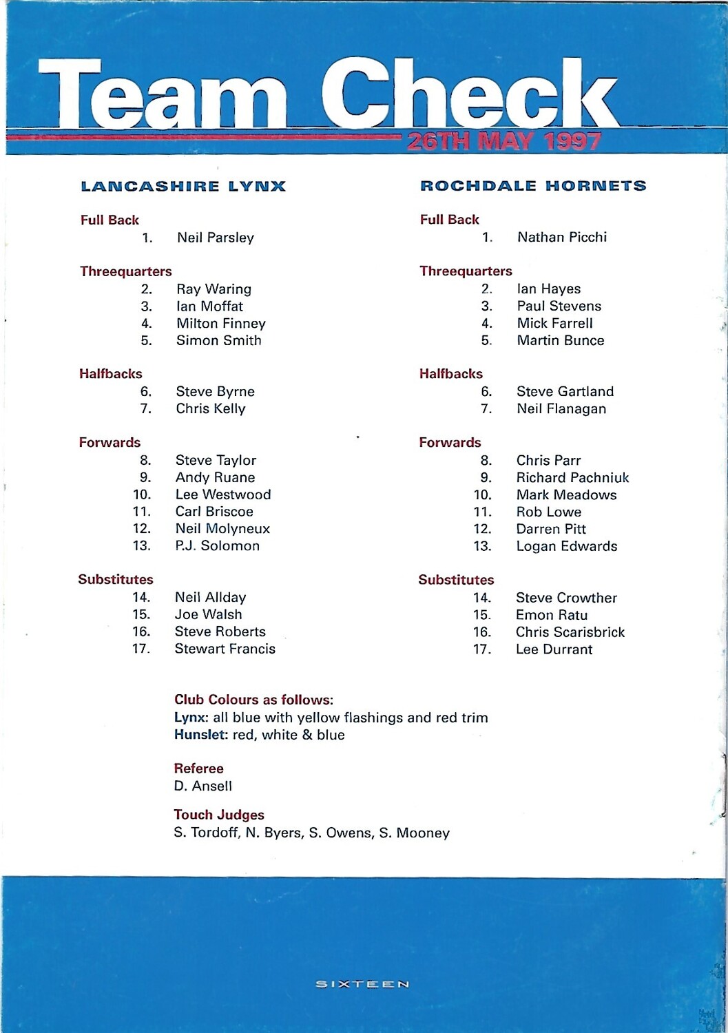 1997 Lancashire Lynx, v Rochdale Hornets Rugby League Programme