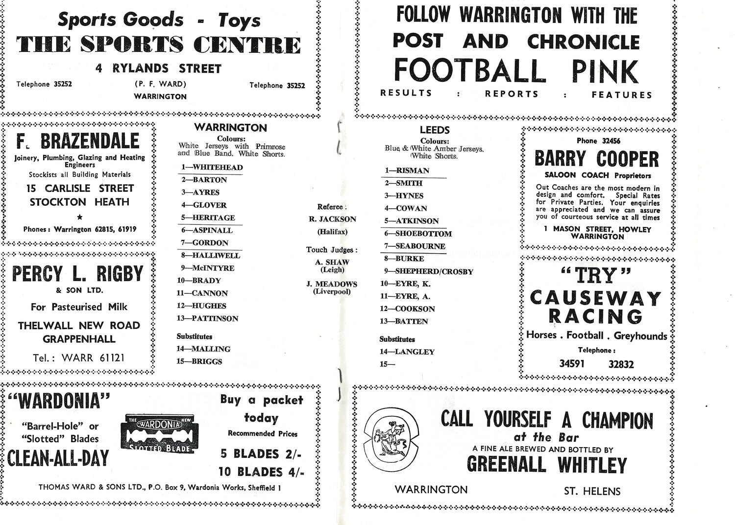 1969/70 Warrington v Leeds (21/02/1970) Rugby League Challenge Cup, 2nd Round Rugby League Programme