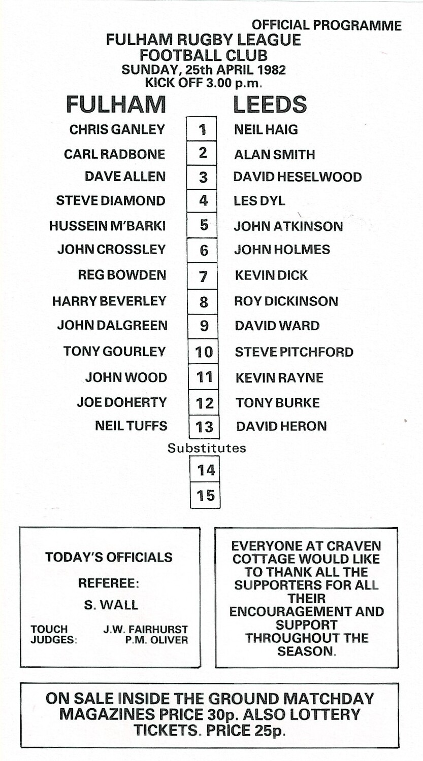 1981/82 Fulham v Leeds Rugby League programme & Team Sheet/Programme