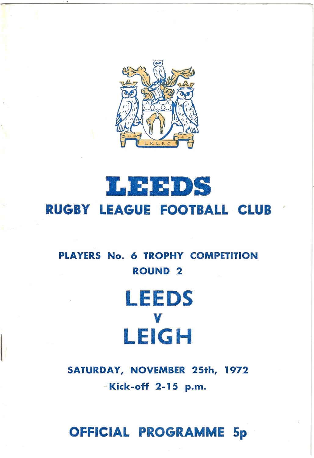 1972/73 Leeds v Leigh (25/11/1972) Players No. 6 Trophy Competition Round 2 Rugby League Programme