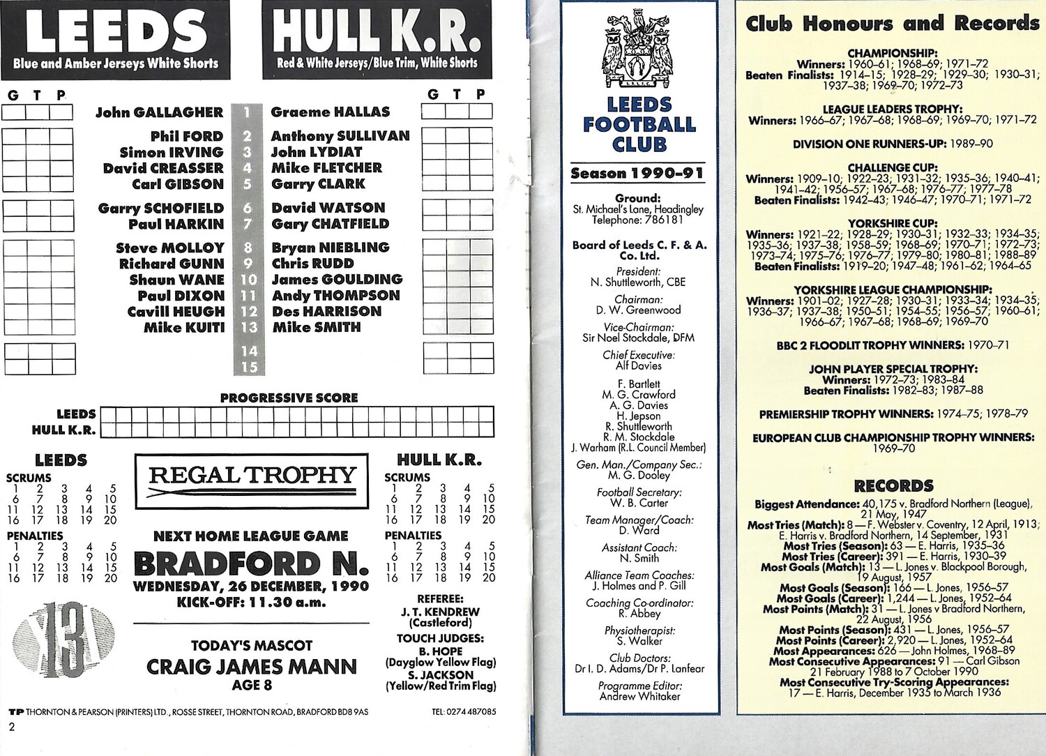 1990/91 Leeds v Hull Kingston Rovers (02/12/1990) 1st Round Regal Trophy Rugby League Programme