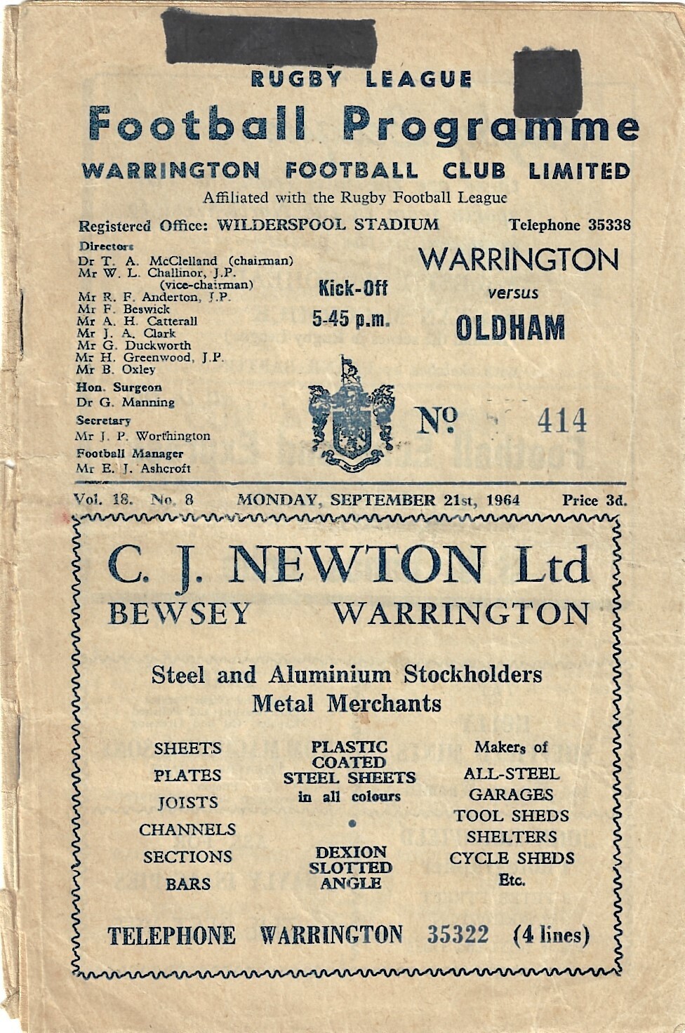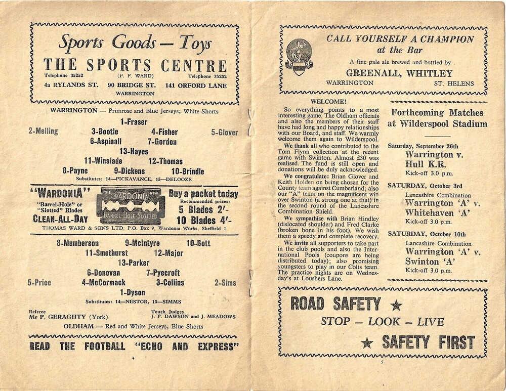 1964/65 Warrington v Oldham Rugby League programme