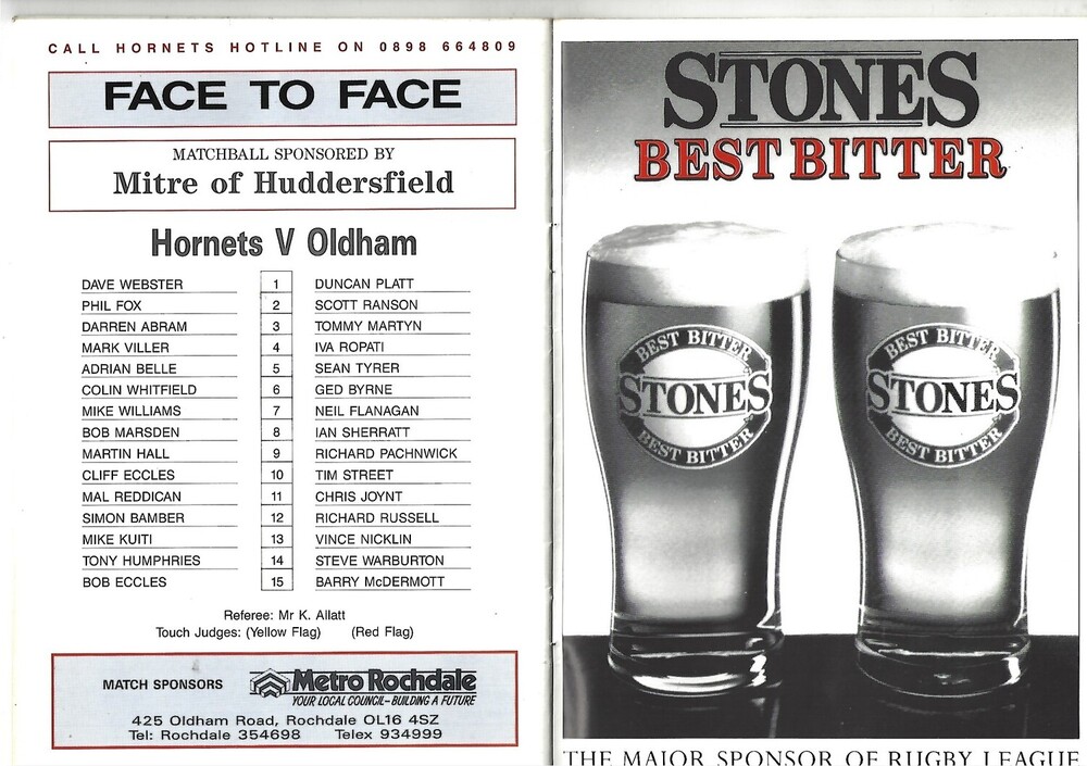 1991/92 Rochdale Hornets v Oldham Rugby League Programme