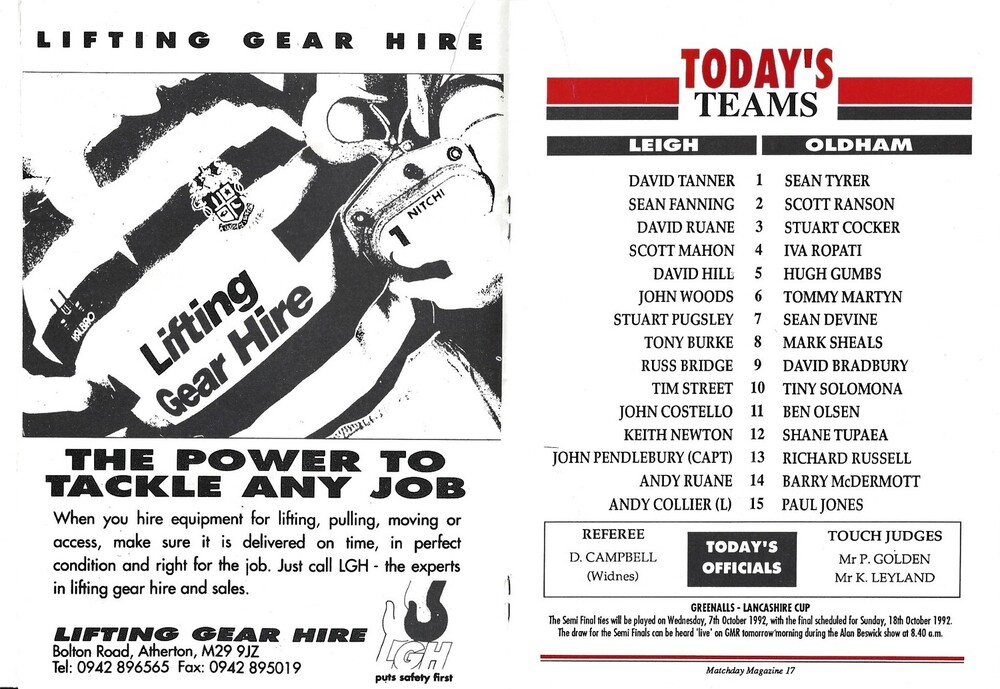 1992/93 Leigh v Oldham Lancashire Cup 2nd Round Rugby League Programme