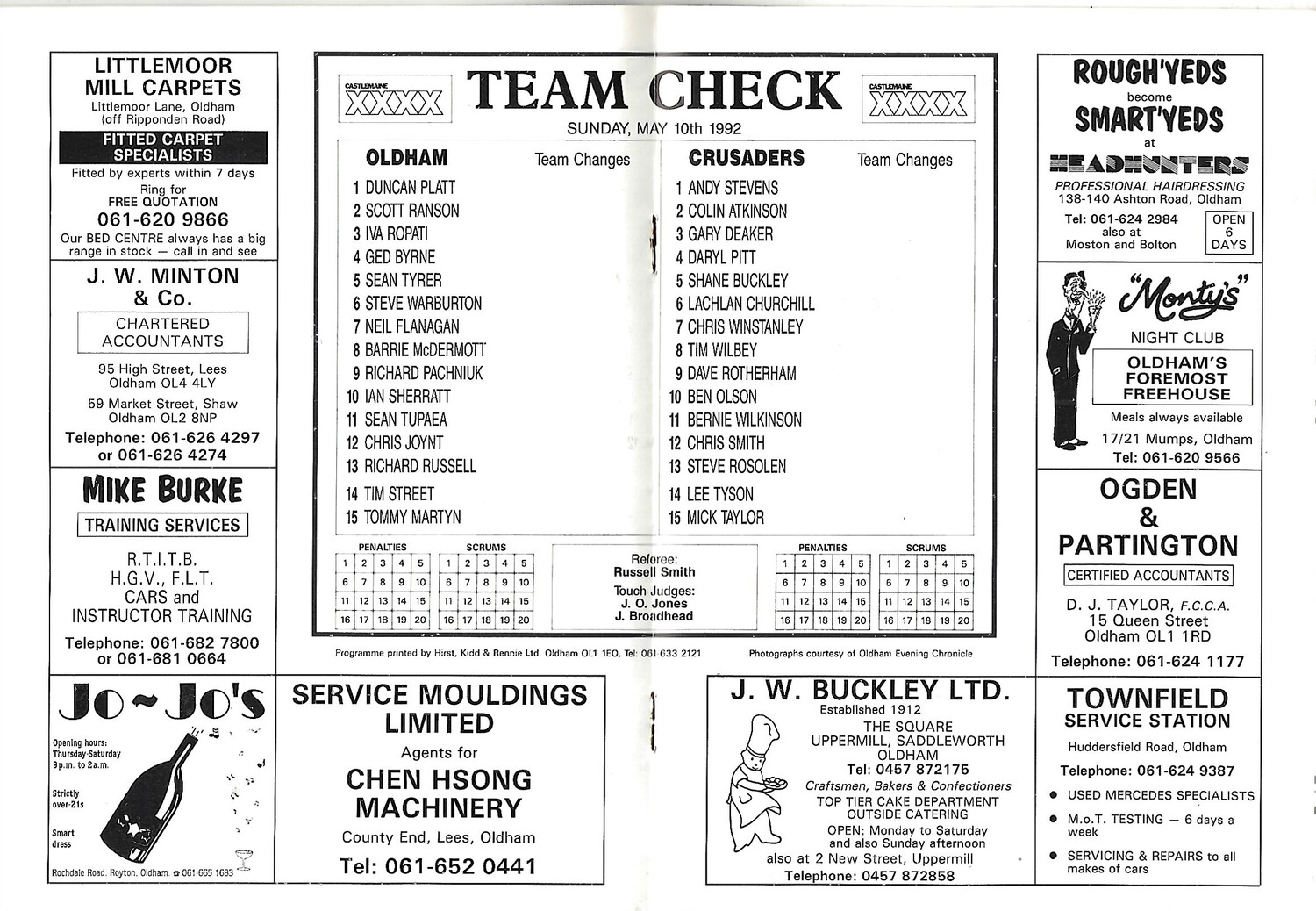 1991/92 Oldham v London Crusaders (10/05/1992) Rugby League Programme