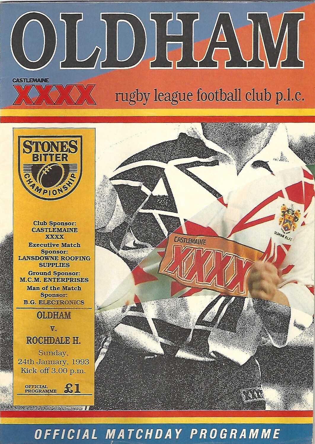 1992/93 Oldham v Rochdale Hornets (24/01/1993) Rugby League Programme