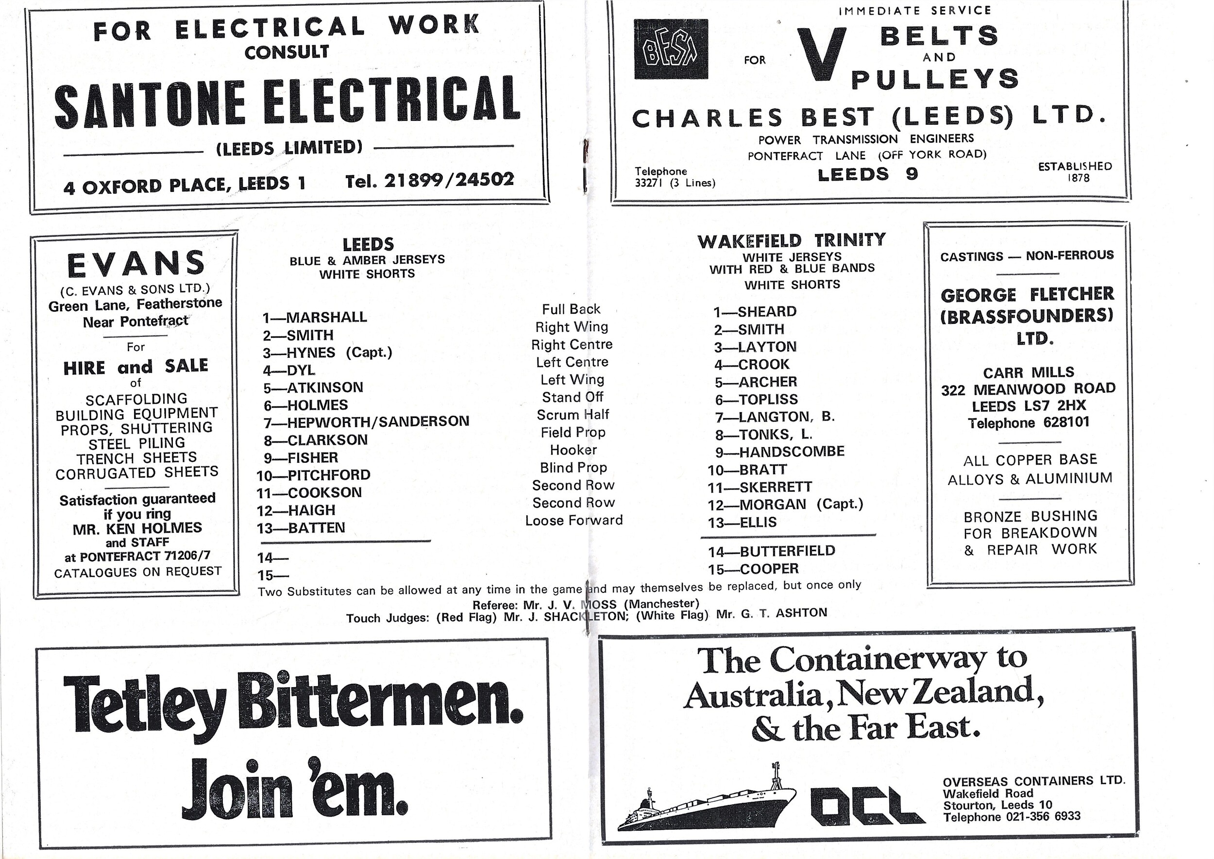 1974/75 Leeds v Wakefield Trinity (26/12/1974) Rugby League Programme