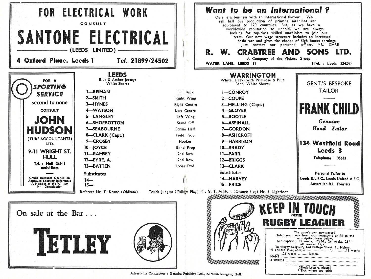 1968/69 Leeds v Warrington (14/09/1968) Rugby League Programme