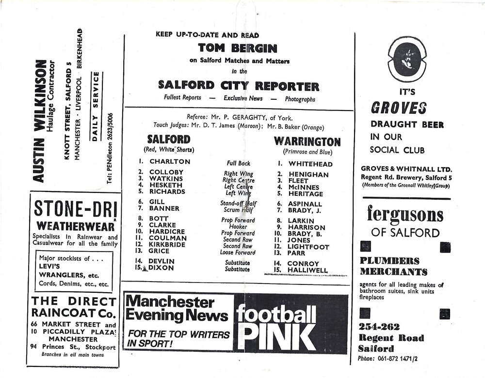 1970/71 Salford v Warrington Rugby League Programme