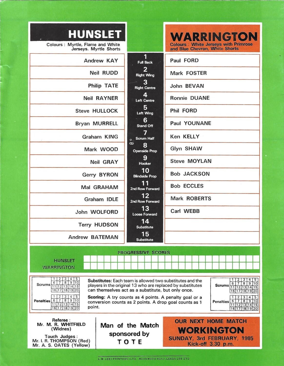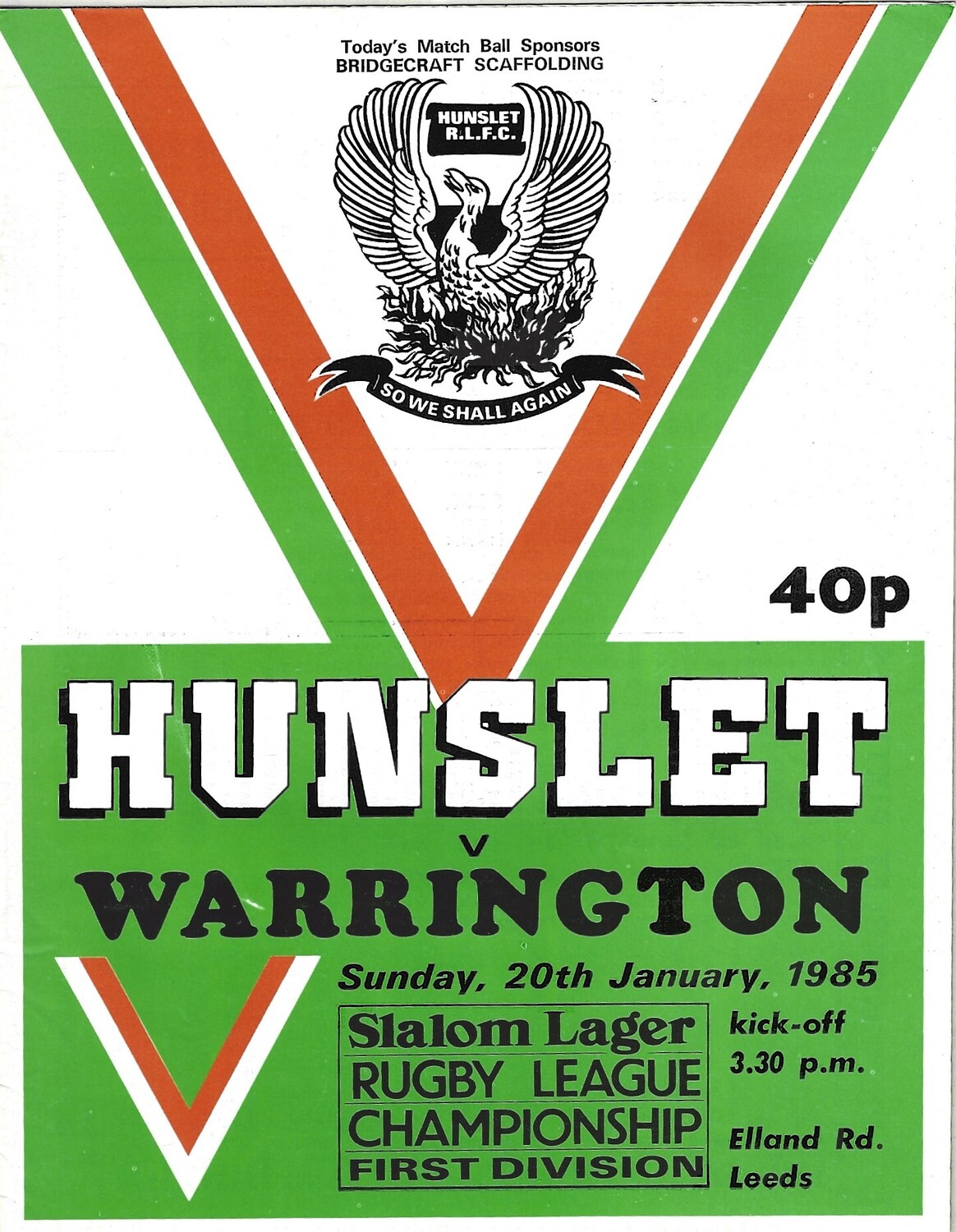 1984/85 Hunslet v Warrington Rugby League programme