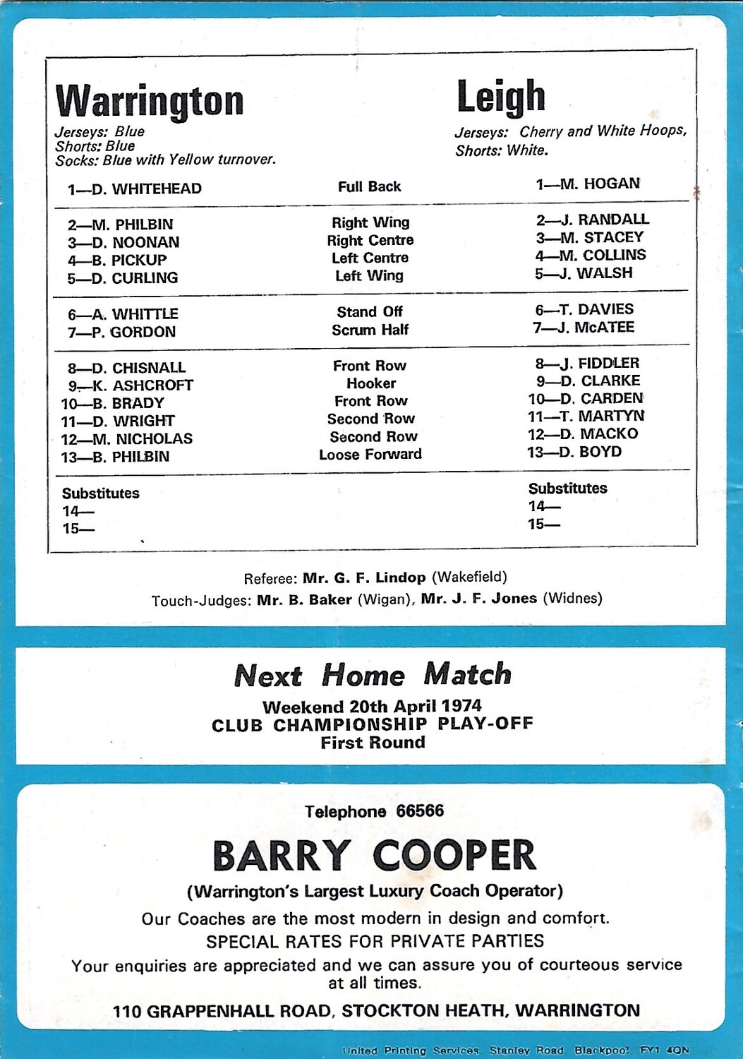 1973/74 Warrington v Leigh Rugby League Programme