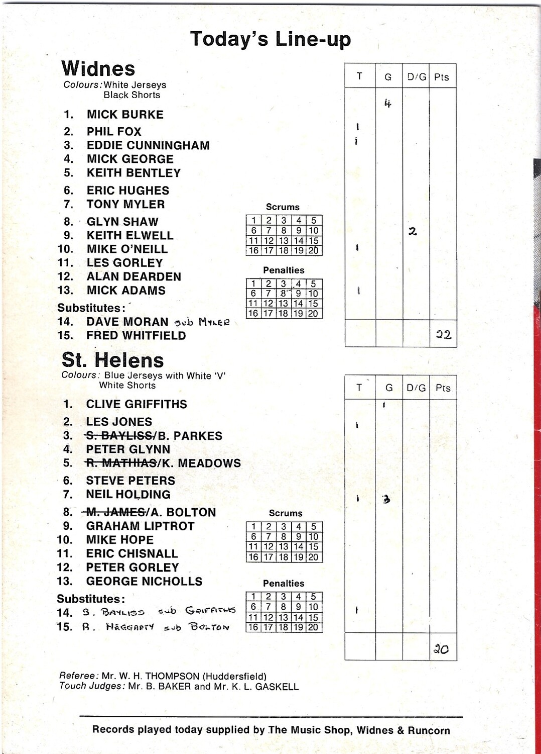 Slight creasing, discoloration, rusty staples, score/team changes in ink on team line up page (as per photo).