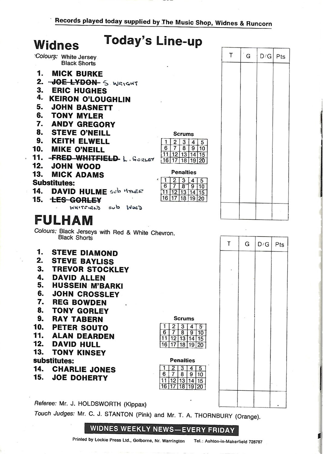 Slight creasing, discoloration, rusty staples, score/team changes in ink on team line up page (as per photo).