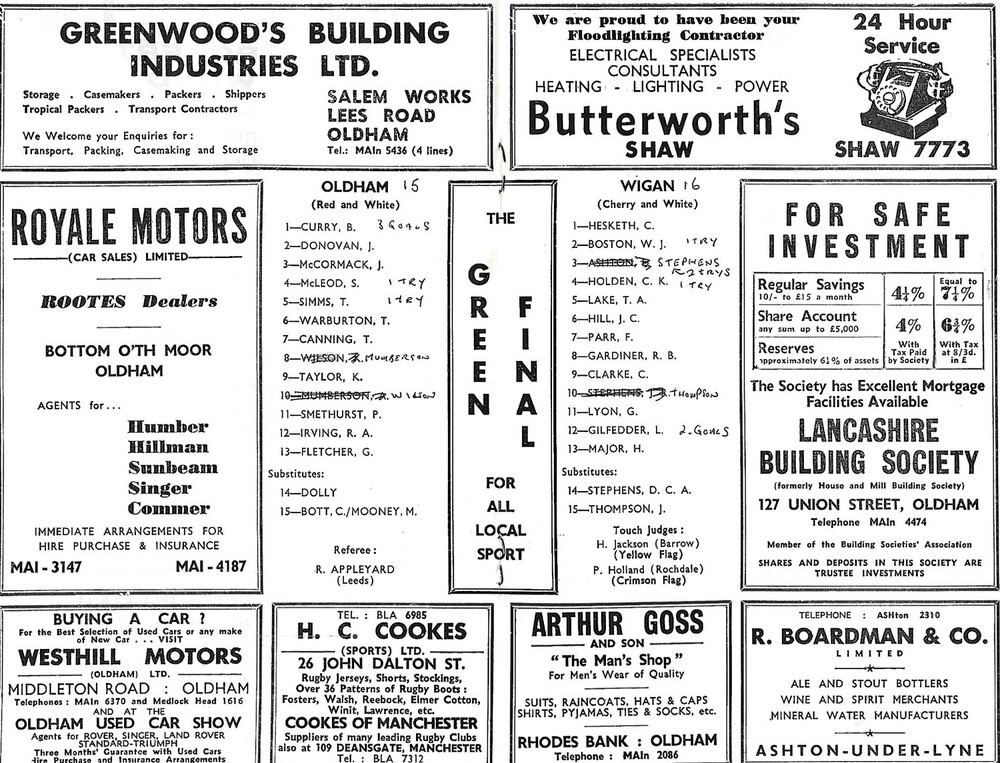 Vertical fold, creasing, discoloration, rusty staples/staining, score in ink on front page, score/team changes in ink on team line up page (as per photo).