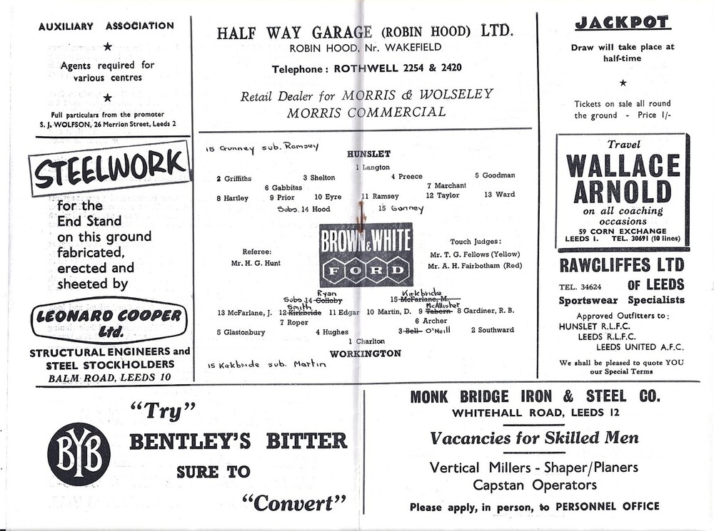 1964/65 Hunslet v Workington Town Rugby League Programme