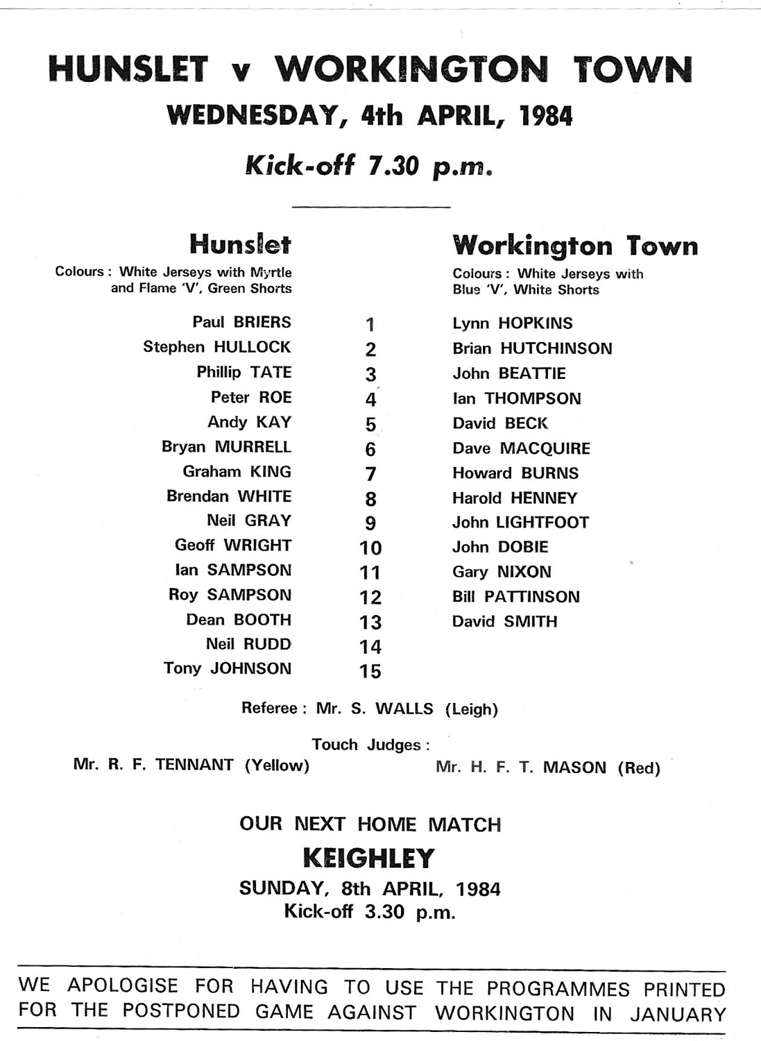 1983/84 Hunslet v Workington Town Rugby League Team Sheet