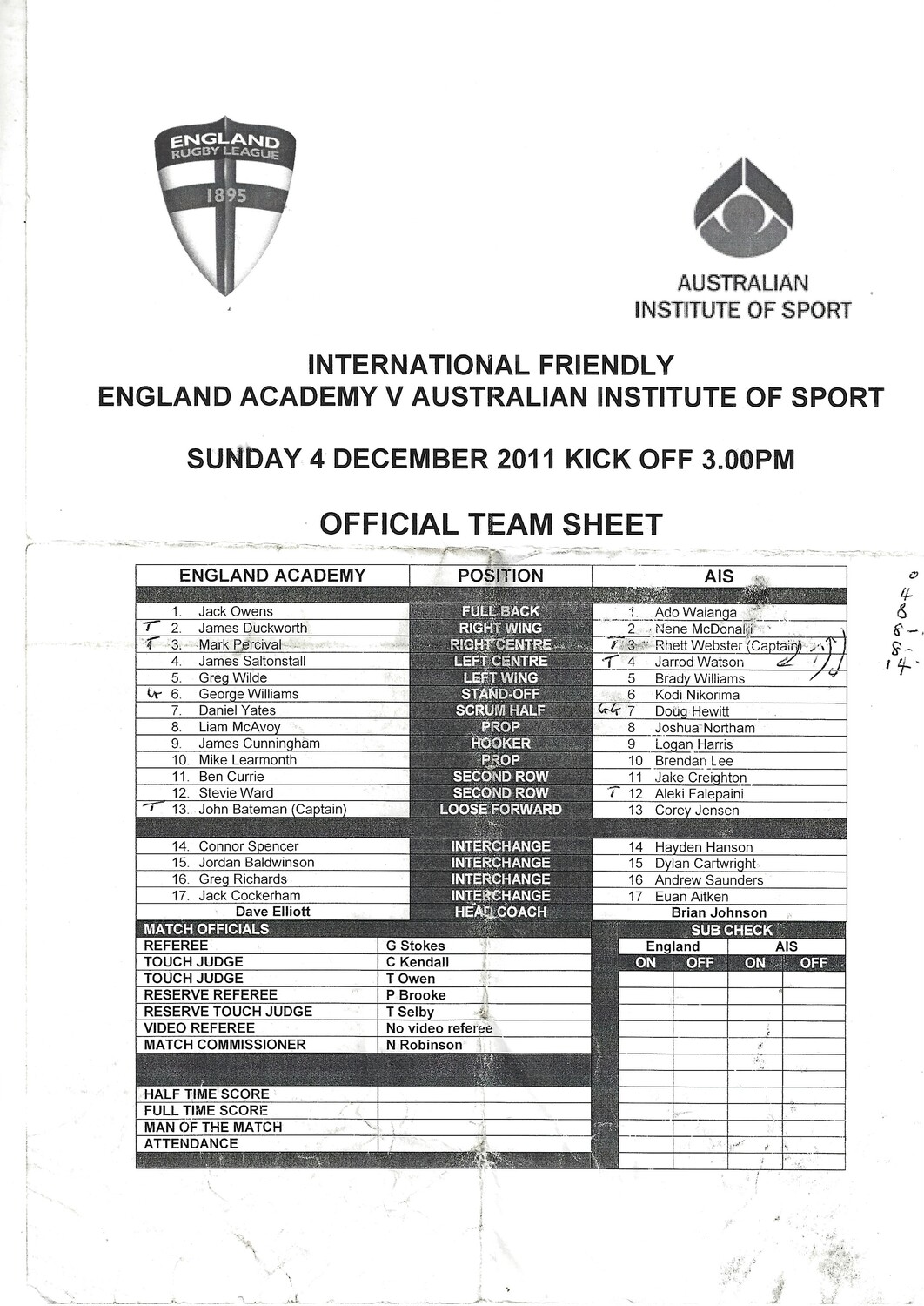2011 England Academy v Australian Institute of Sport (04/11/2011) Team Sheet (handwriting)