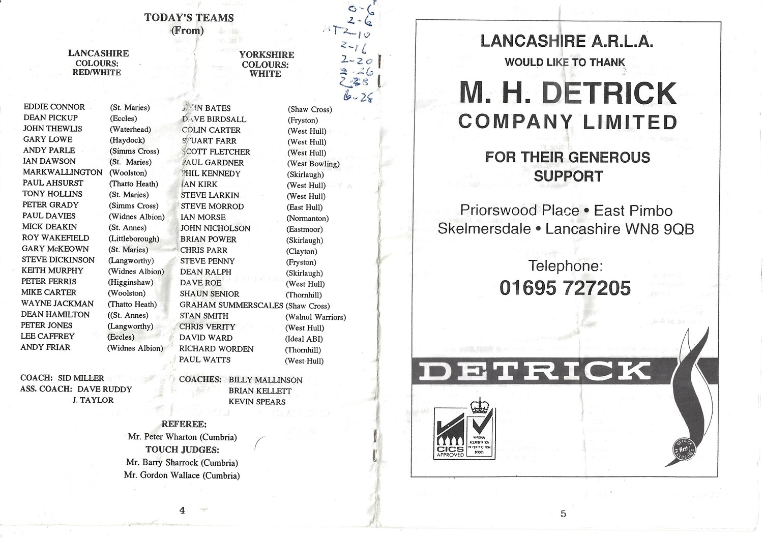 1996 Lancashire v Yorkshire (24/11/1996) BARLA County Championship Rugby League Programme