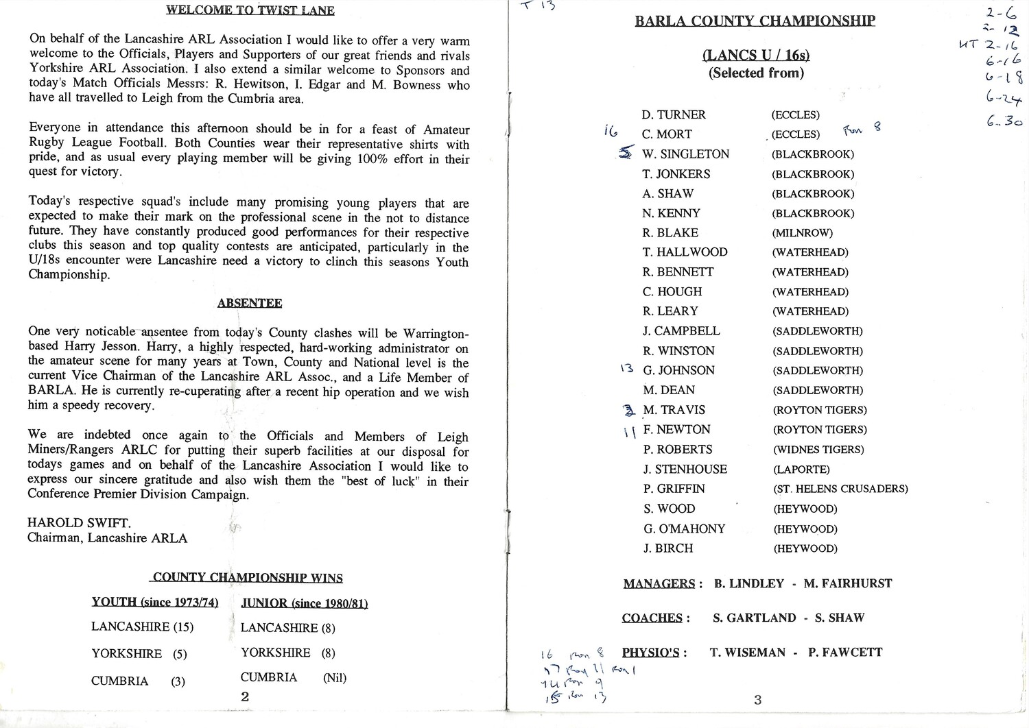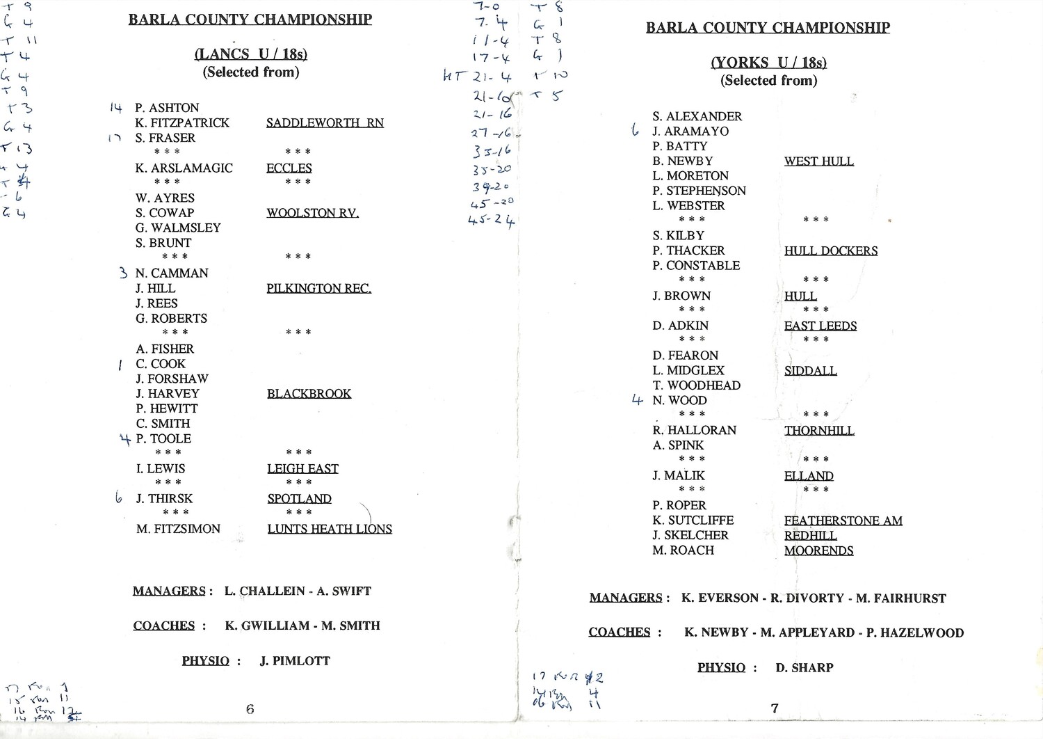 Vertical fold, creasing, discolouration. Score/team changes in ink on team line up page (as per scan)