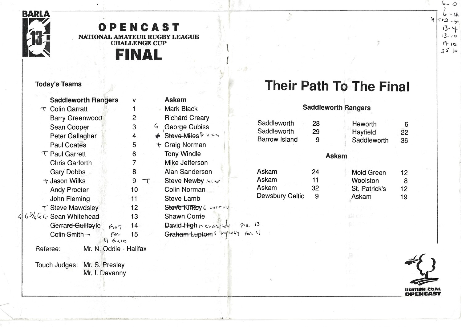 Vertical crease, creasing, dog ears. Score/team changes in ink on team line up page (as per scan)