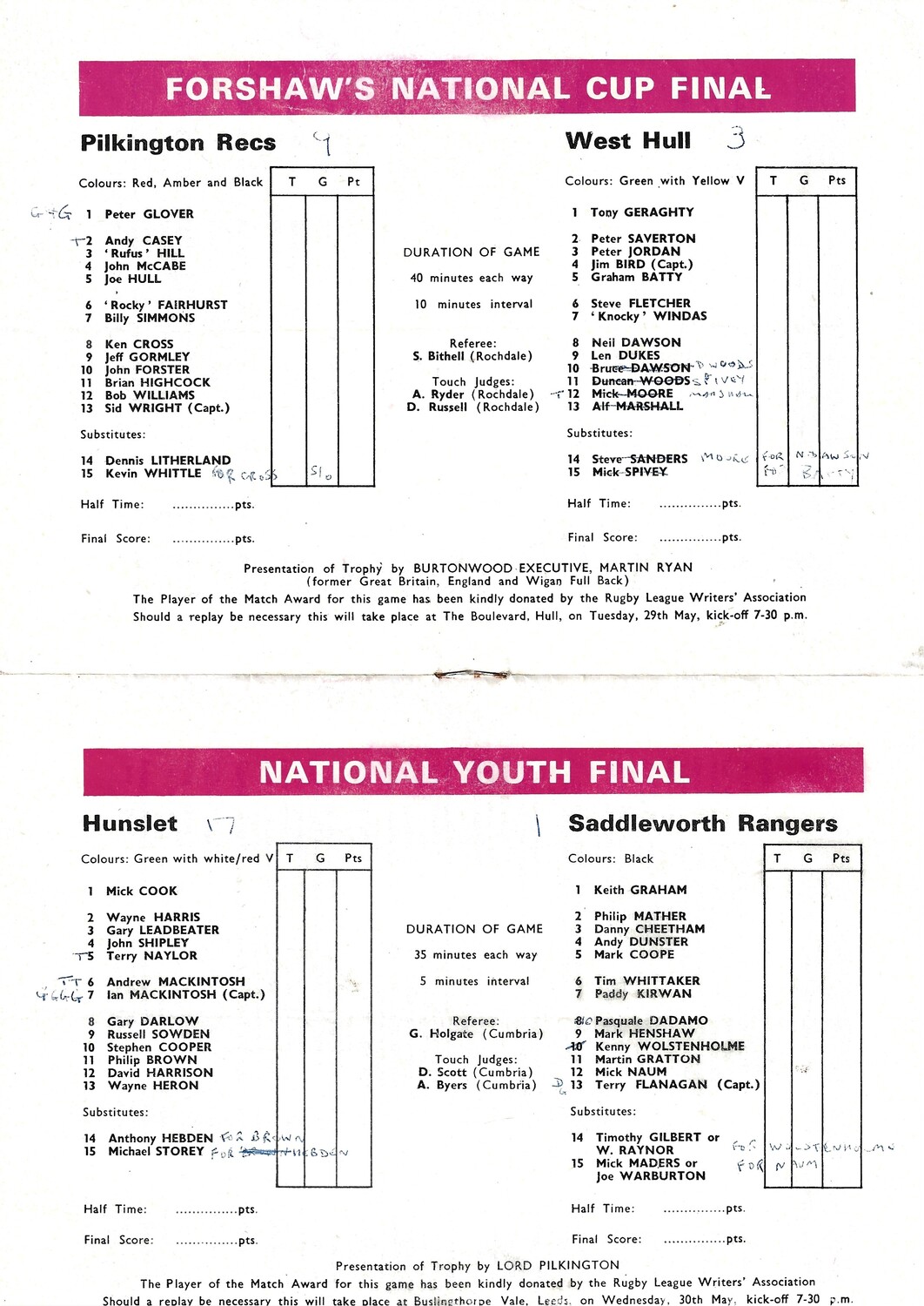 Vertical fold/crease, slight creasing, rusty staples. Score/team changes in ink on team line up page (as per scan)