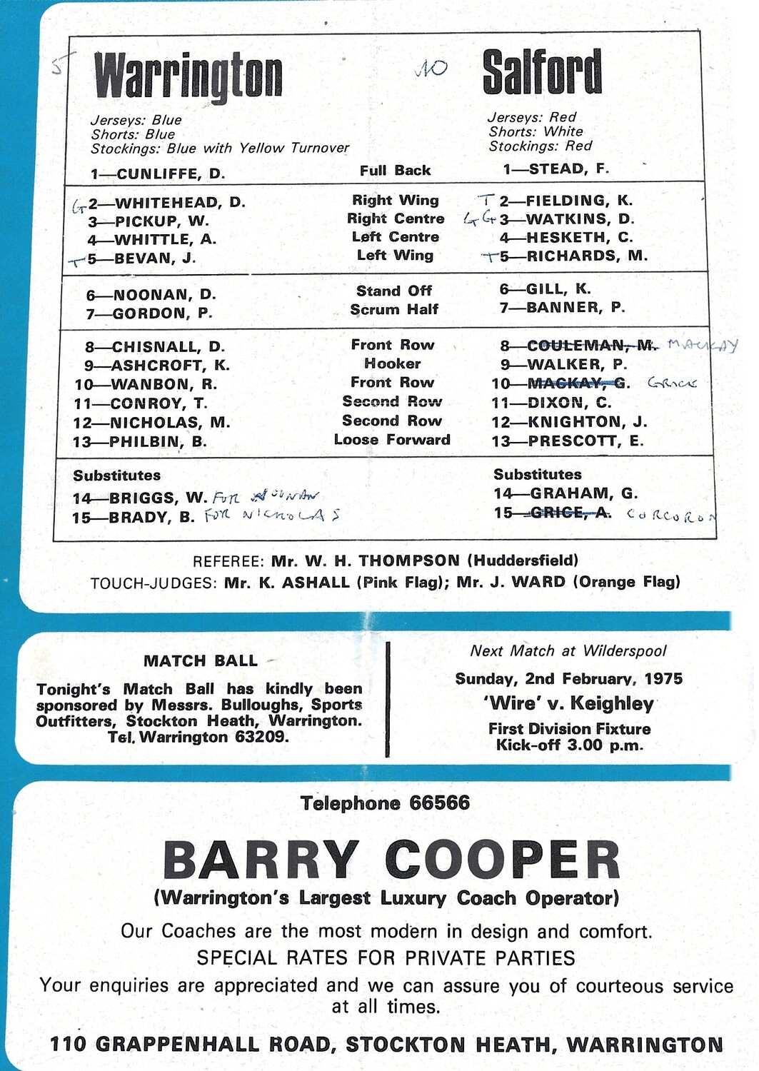 1974/75 Warrington v Salford (28/01/1975) BBC2 Floodlight Competition Final Replay Rugby League Programme