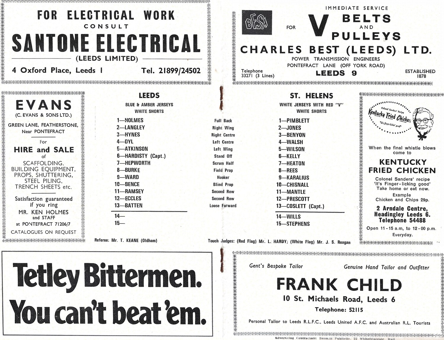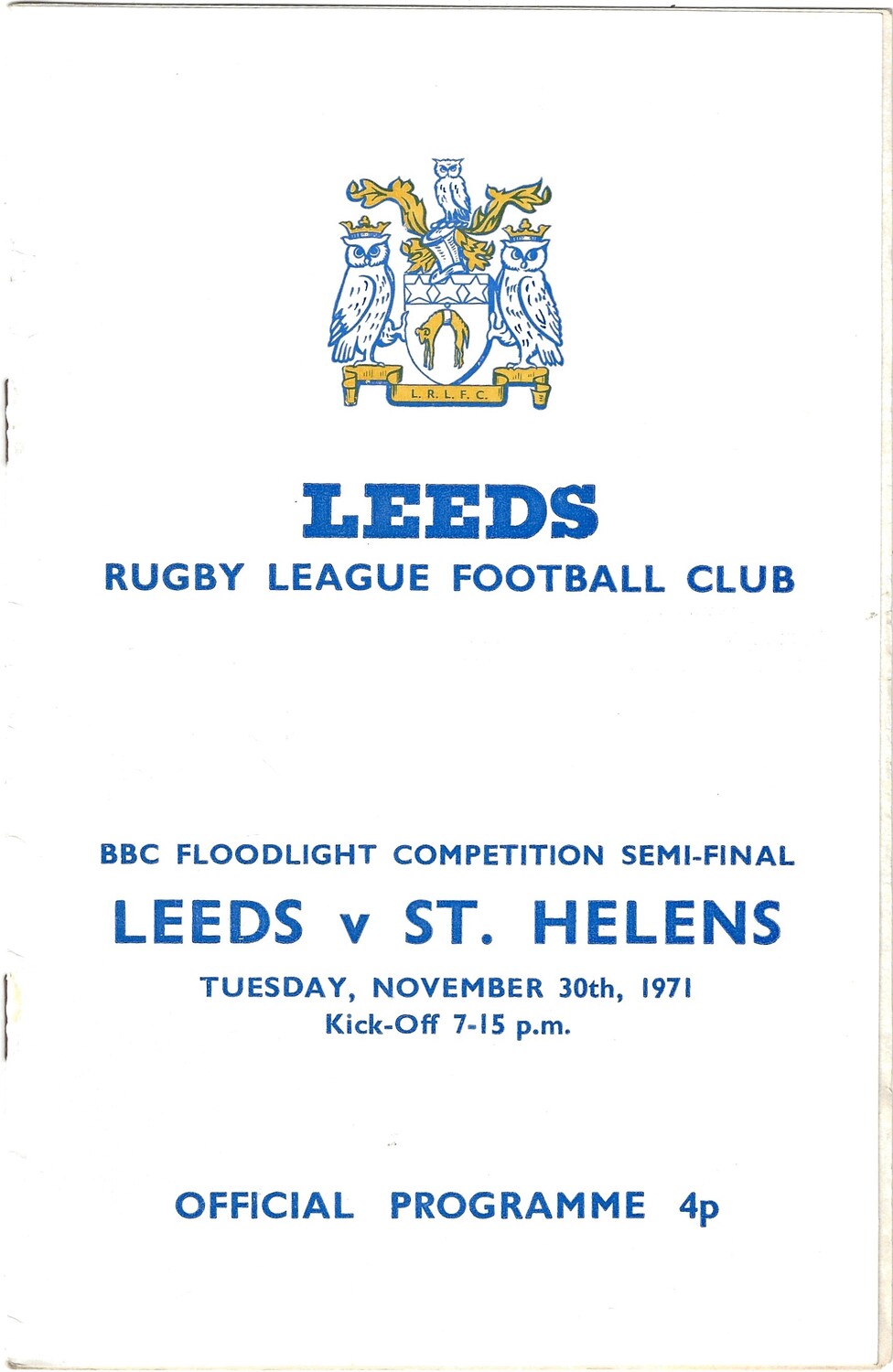 1971 Leeds v St. Helens (30/11/1971) B.B.C Floodlight Competition Semi-Final Rugby League Programme