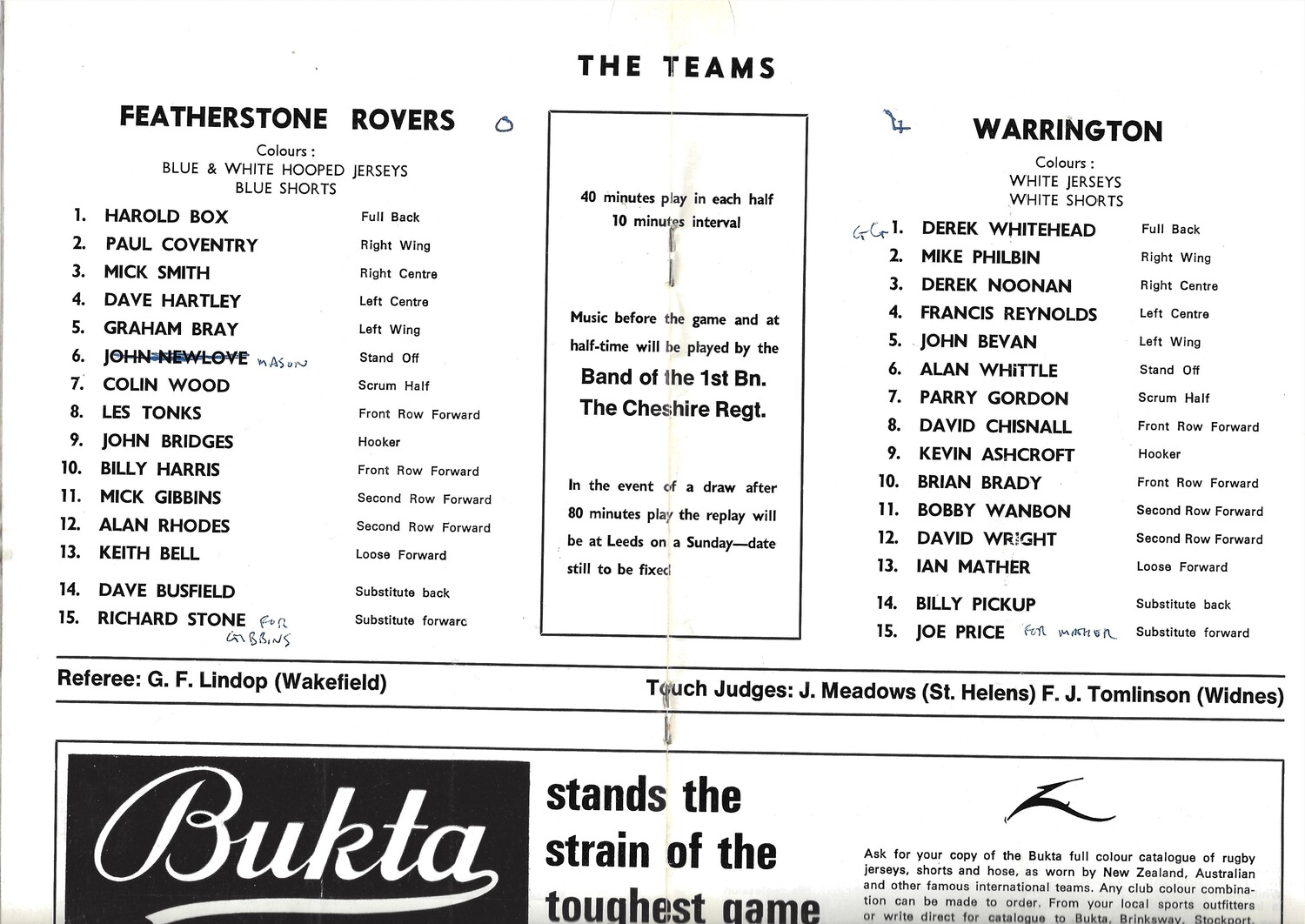 1974 Featherstone Rovers v Warrington (26/01/1974) Captain Morgan Trophy Final Rugby League Programme