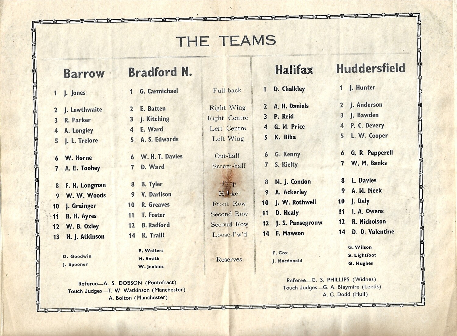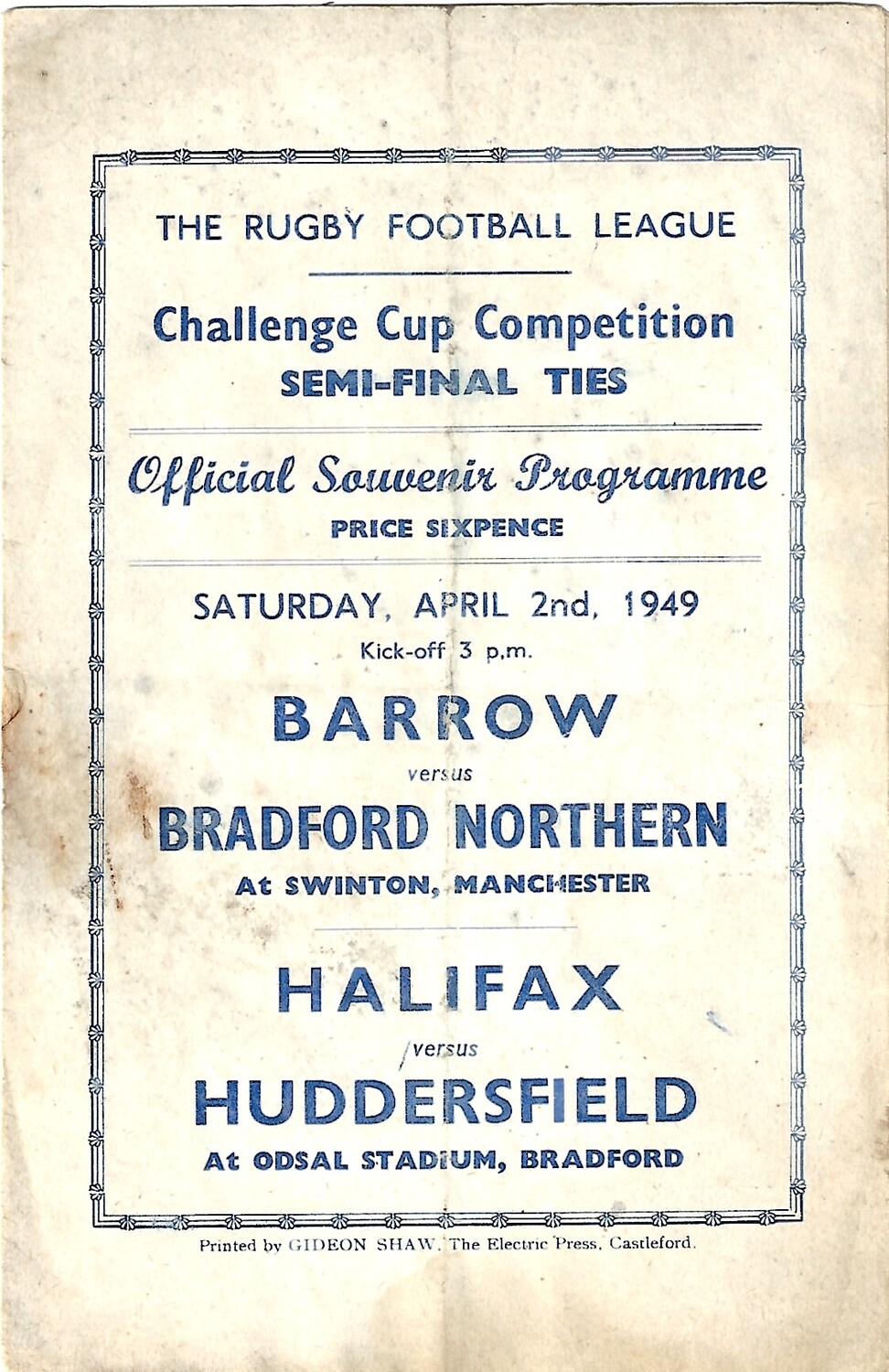 1949 Barrow v Bradford Northern/Halifax v Huddersfield Rugby League Challenge Cup Semi Final Programme